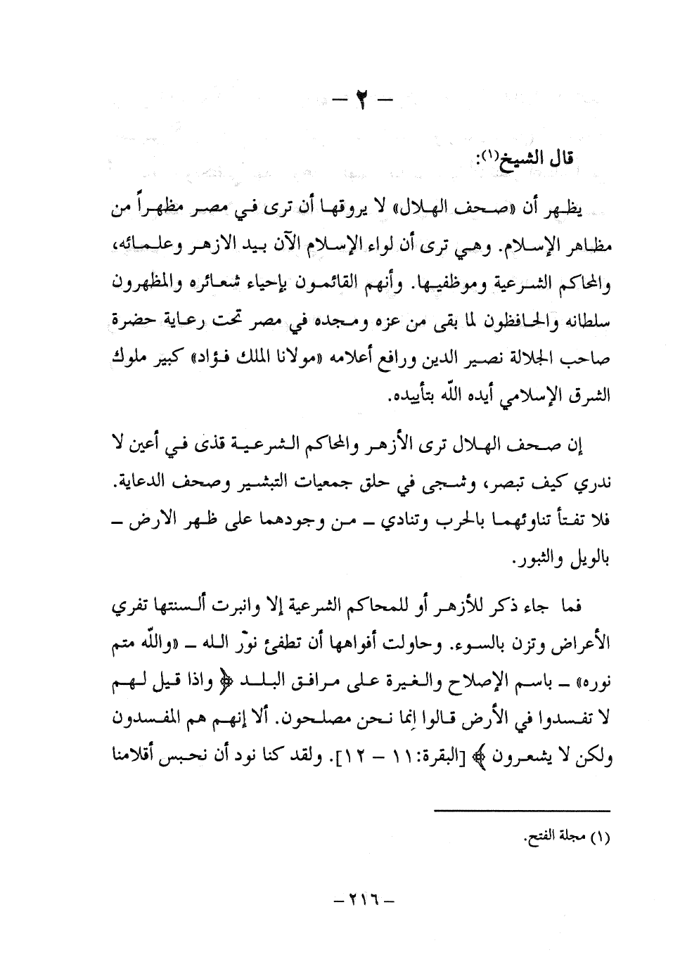فما جاء ذكر للأزهر أو للمحاكم الشرعية إلا وانبرت ألسنتها تفري الأعراض وتزن بالسوء. وحاولت أفواهها أن تطفئ نور الله -"والله متم نوره"- باسم الإصلاح والغيرة على مرافق البلد (وَإِذَا قِيلَ لَهُمْ لاَ تُفْسِدُواْ فِي الأَرْضِ قَالُواْ إِنَّمَا نَحْنُ مُصْلِحُونَ، أَلا إِنَّهُمْ هُمُ الْمُفْسِدُونَ وَلَكِن لاَّ يَشْعُرُونَ) [البقرة: 11 - 12]. ولقد كنا نود أن نحبس أقلامنا