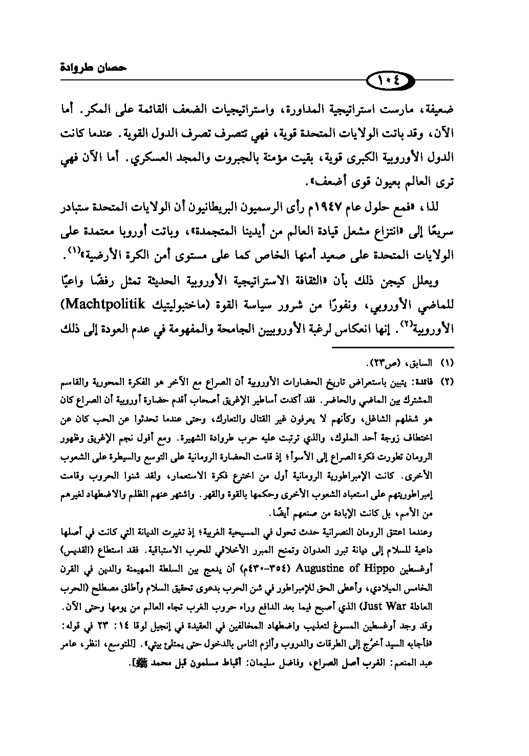 (¬2) فائدة: يتبين باستعراض تاريخ الحضارات الأوروپية أن الصراع مع الآخر هو الفكرة المحورية والقاسم المشترك بين الماضي والحاضر. فقد أكدت أساطير الإغريق أصحاب أقدم حضارة أوروپية أن الصراع كان هو شغلهم الشاغل، وكأنهم لا يعرفون غير القتال والتعارك، وحتى عندما تحدثوا عن الحب كان عن اختطاف زوجة أحد الملوك، والذي ترتبت عليه حرب طروادة الشهيرة. ومع أفول نجم الإغريق وظهور الرومان تطورت فكرة الصراع إلى الأسوأ؛ إذ قامت الحضارة الرومانية على التوسع والسيطرة على الشعوب الأخرى. كانت الإمپراطورية الرومانية أول من اخترع فكرة الاستعمار، ولقد شنوا الحروب وقامت إمپراطوريتهم على استعباد الشعوب الأخرى وحكمها بالقوة والقهر. واشتهر عنهم الظلم والاضطهاد لغيرهم من الأمم، بل كانت الإبادة من صنعهم أيضًا. وعندما اعتنق الرومان النصرانية حدث تحول في المسيحية الغربية؛ إذ تغيرت الديانة التي كانت في أصلها داعية للسلام إلى ديانة تبرر العدوان وتمنح المبرر الأخلاقي للحرب الاستباقية. فقد استطاع (القديس) أوغسطين Augustine of Hippo (354 - 430 م) أن يدمج بين السلطة المهيمنة والدين في القرن الخامس الميلادي، وأعطى الحق للإمپراطور في شن الحرب بدعوى تحقيق السلام وأطلق مصطلح (الحرب العادلة Just War) الذي أصبح فيما بعد الدافع وراء حروب الغرب تجاه العالم من يومها وحتى الآن. وقد وجد أوغسطين المسوغ لتعذيب واضطهاد المخالفين في العقيدة في إنجيل لوقا 14: 23 في قوله: «فأجابه السيد أخرُج إلى الطرقات والدروب وألزم الناس بالدخول حتى يمتلئ بيتي». [للتوسع، انظر، عامر عبد المنعم: الغرب أصل الصراع، وفاضل سليمان: أقباط مسلمون قبل محمد - صلى الله عليه وسلم -].
