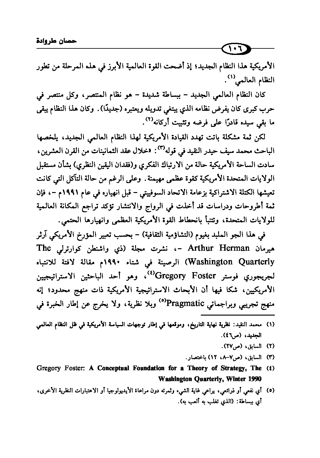 في هذا الجو الملبد بغيوم (التشاؤمية الثقافية) - بحسب تعبير المؤرخ الأمريكي آرثر هيرمان Arthur Herman -، نشرت مجلة (ذي واشنطن كوارترلي The Washington Quarterly) الرصينة في شتاء 1990م مقالة لافتة للانتباه لجريجوري فوستر Gregory Foster (¬4) ، وهو أحد الباحثين الاستراتيچيين الأمريكيين، شكا فيها أن الأبحاث الاستراتيچية الأمريكية ذات منهج محدود؛ إنه منهج تجريبي وپراجماتي Pragmatic (¬5) وبلا نظرية، ولا يخرج عن إطار الخبرة في
