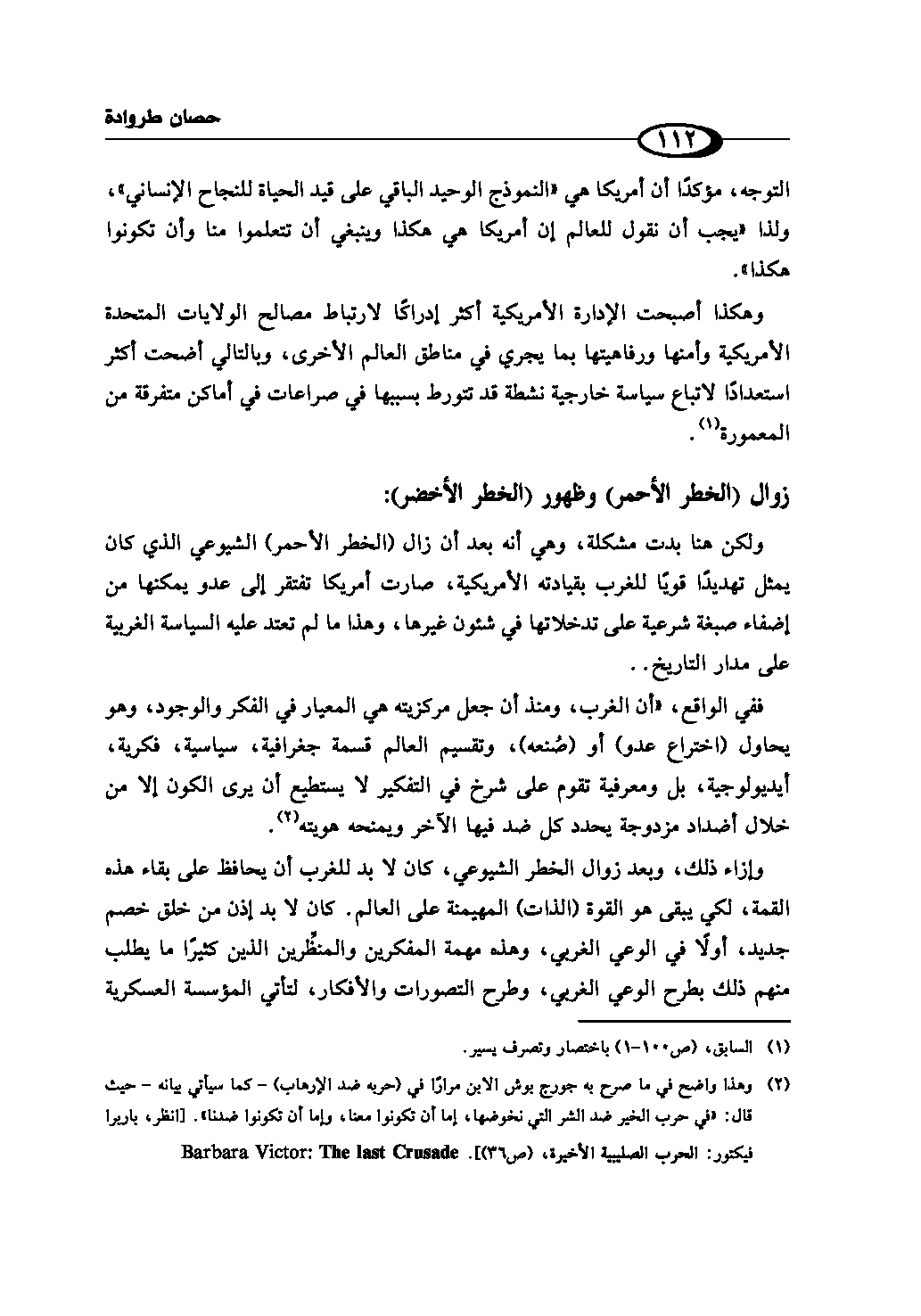 (¬2) وهذا واضح في ما صرح به چورچ بوش الابن مرارًا في (حربه ضد الإرهاب) - كما سيأتي بيانه - حيث قال: «في حرب الخير ضد الشر التي نخوضها، إما أن تكونوا معنا، وإما أن تكونوا ضدنا». [انظر، باربرا فيكتور: الحرب الصليبية الأخيرة، ص (36). Barbara Victor: The Last Crusade].