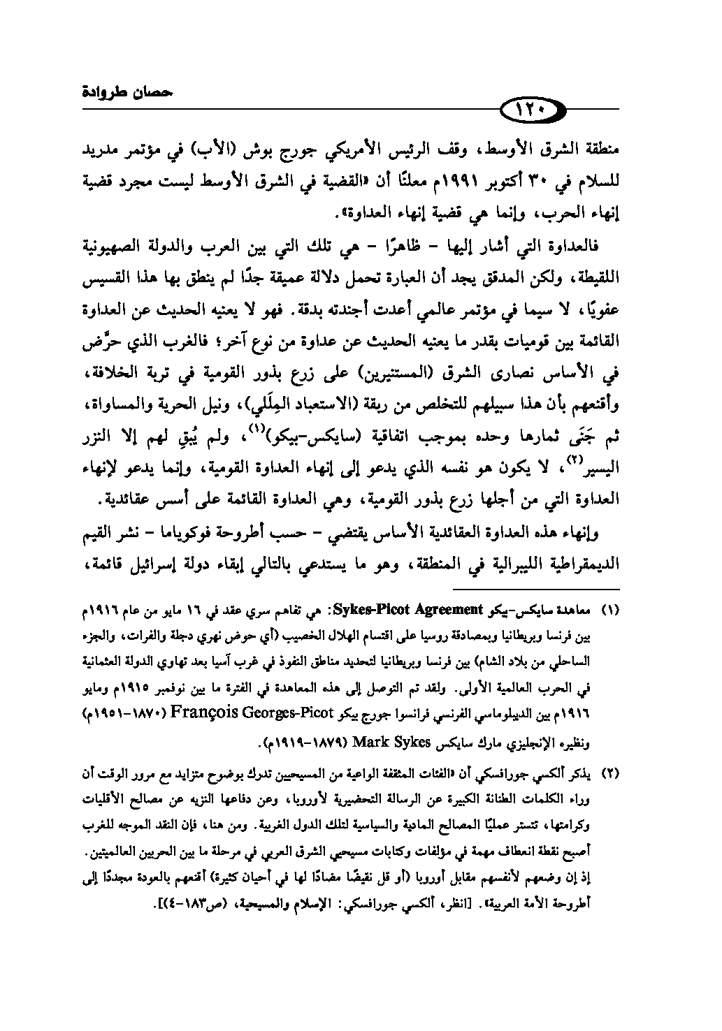 (¬2) يذكر ألكسي چورافسكي أن «الفئات المثقفة الواعية من المسيحيين تدرك بوضوح متزايد مع مرور الوقت أن وراء الكلمات الطنانة الكبيرة عن الرسالة التحضيرية لأوروپا، وعن دفاعها النزيه عن مصالح الأقليات وكرامتها، تتستر عمليًا المصالح المادية والسياسية لتلك الدول الغربية. ومن هنا، فإن النقد الموجه للغرب أصبح نقطة انعطاف مهمة في مؤلفات وكتابات مسيحيي الشرق العربي في مرحلة ما بين الحربين العالميتين .. إذ إن وضعهم لأنفسهم مقابل أوروپا (أو قل نقيضًا مضادًا لها في أحيان كثيرة) أقنعهم بالعودة مجددًا إلى أطروحة الأمة العربية». [انظر، ألكسي چورافسكي: الإسلام والمسيحية، ص (183 - 4)].