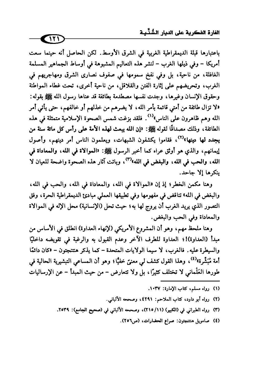 باعتبارها قبلة الديمقراطية الغربية في الشرق الأوسط. لكن الحاصل أنه حينما سعت أمريكا - وفي ذيلها الغرب - لنشر هذه التعاليم المشبوهة في أوساط الجماهير المسلمة الغافلة، من ناحية، بل وفي نفخ سمومها في صفوف نصارى الشرق ومهاجريهم في الغرب، وتحريضهم على إثارة الفتن والقلاقل، من ناحية أخرى، تحت غطاء المواطنة وحقوق الإنسان وغيرها، وجدت نفسها مصطدمة بطائفة قد عناها رسول الله - صلى الله عليه وسلم - بقوله: «لا تزال طائفة من أمتي قائمة بأمر الله، لا يضرهم من خذلهم أو خالفهم، حتى يأتي أمر الله وهم ظاهرون على الناس» (¬1). فلقد بزغت شمس الصحوة الإسلامية متمثلة في هذه الطائفة، وذلك مصداقًا لقوله - صلى الله عليه وسلم -: «إن الله يبعث لهذه الأمة على رأس كل مائة سنة من يجدد لها دينها» (¬2)، فقاموا يكشفون الشبهات، ويعلمون الناس أمر دينهم، وأصول إيمانهم، والذي هو أوثق عراه كما أخبر الرسول - صلى الله عليه وسلم -: «الموالاة في الله، والمعاداة في الله، والحب في الله، والبغض في الله» (¬3)، وباتت آثار هذه الصحوة واضحة للعيان لا ينكرها إلا جاحد.