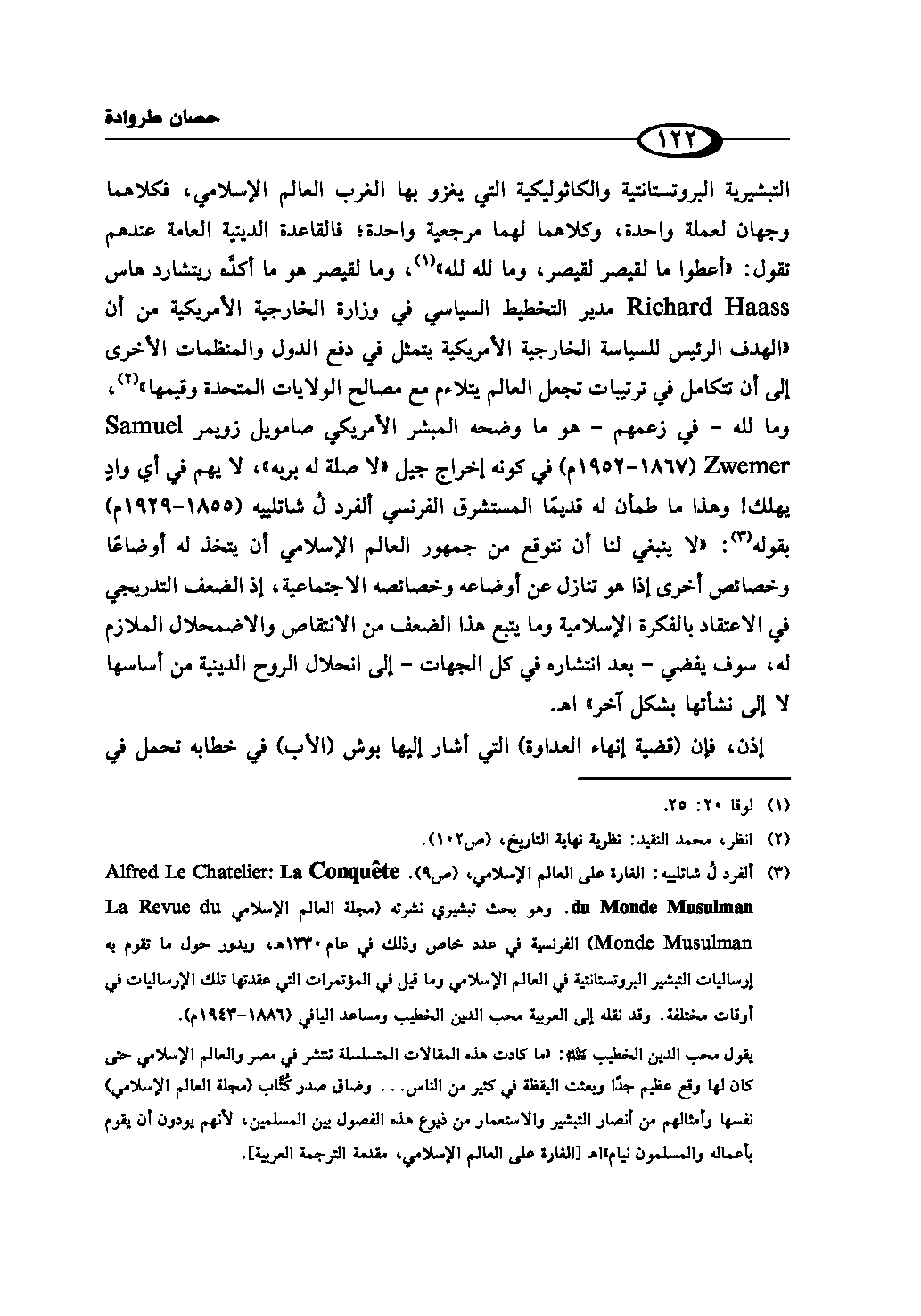 التبشيرية الپروتستانتية والكاثوليكية التي يغزو بها الغرب العالم الإسلامي، فكلاهما وجهان لعملة واحدة، وكلاهما لهما مرجعية واحدة؛ فالقاعدة الدينية العامة عندهم تقول: «أعطوا ما لقيصر لقيصر، وما لله لله» (¬1)، وما لقيصر هو ما أكدَّه ريتشارد هاس Richard Haass مدير التخطيط السياسي في وزارة الخارجية الأمريكية من أن «الهدف الرئيس للسياسة الخارجية الأمريكية يتمثل في دفع الدول والمنظمات الأخرى إلى أن تتكامل في ترتيبات تجعل العالم يتلاءم مع مصالح الولايات المتحدة وقيمها» (¬2)، وما لله - في زعمهم - هو ما وضحه المبشر الأمريكي صامويل زويمر Samuel Zwemer (1867 - 1952 م) في كونه إخراج جيل «لا صلة له بربه»، لا يهم في أي وادٍ يهلك! وهذا ما طمأن له قديمًا المستشرق الفرنسي ألفرد لُ شاتلييه (1855 - 1929م) بقوله (¬3):