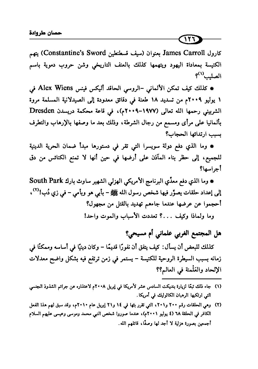 كارول James Carroll بعنوان (سيف قسطنطين Constantine's Sword) يتهم الكنيسة بمعاداة اليهود ويتهمها كذلك بالعنف التاريخي وشن حروب دموية باسم الصليب (¬1)؟