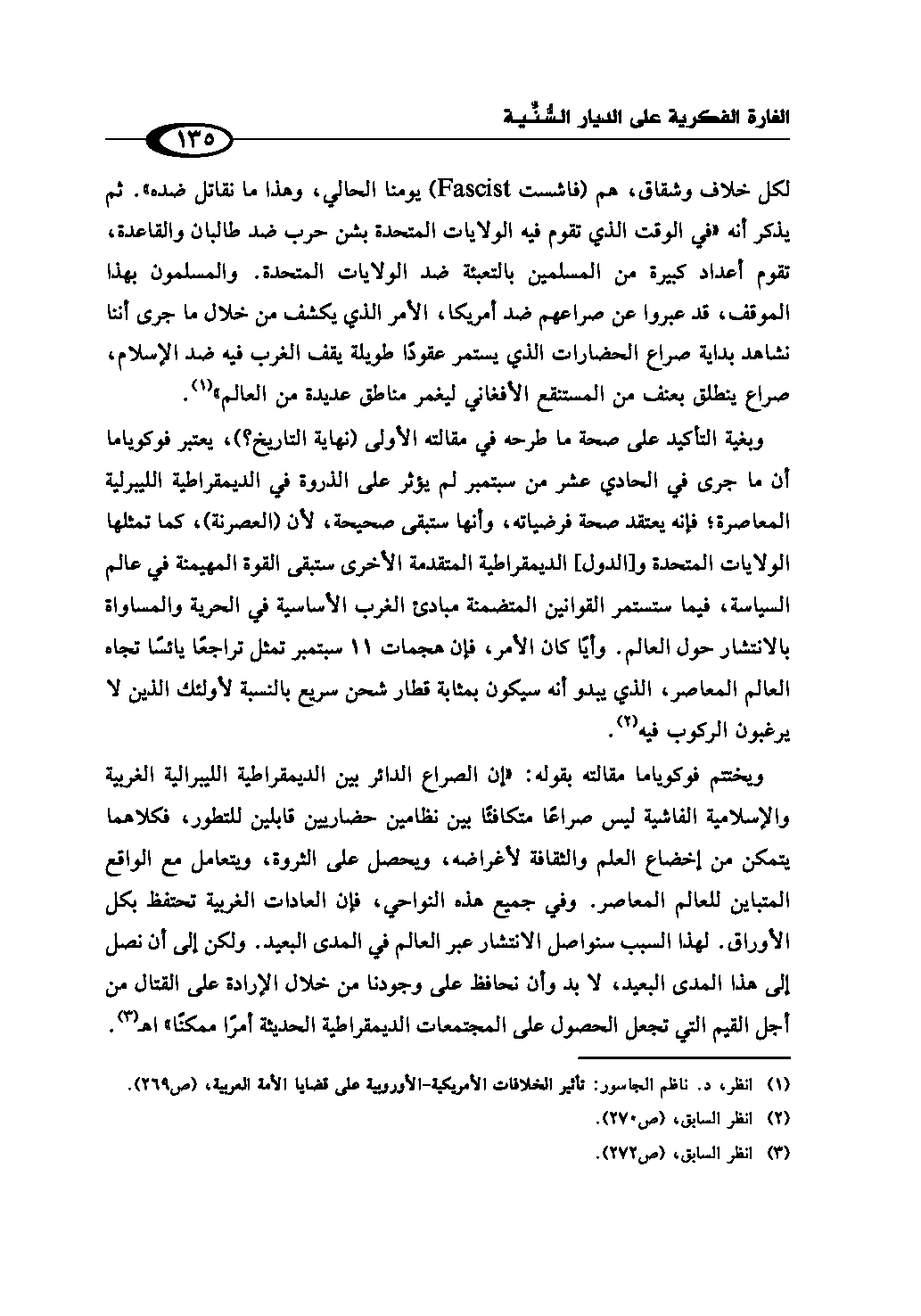 لكل خلاف وشقاق، هم (فاشست Fascist) يومنا الحالي، وهذا ما نقاتل ضده». ثم يذكر أنه «في الوقت الذي تقوم فيه الولايات المتحدة بشن حرب ضد طالبان والقاعدة، تقوم أعداد كبيرة من المسلمين بالتعبئة ضد الولايات المتحدة. والمسلمون بهذا الموقف، قد عبروا عن صراعهم ضد أمريكا، الأمر الذي يكشف من خلال ما جرى أننا نشاهد بداية صراع الحضارات الذي يستمر عقودًا طويلة يقف الغرب فيه ضد الإسلام، صراع ينطلق بعنف من المستنقع الأفغاني ليغمر مناطق عديدة من العالم» (¬1).