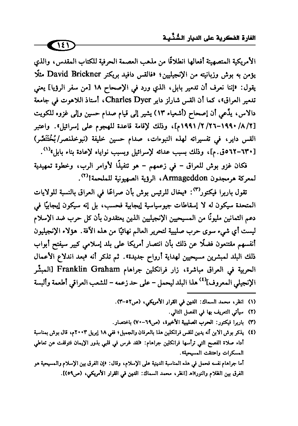 تقول باربرا فيكتور (¬3): «يخال للرئيس بوش بأن صراعًا في العراق بالنسبة للولايات المتحدة سيكون له لا إسقاطات چيوسياسية إيجابية فحسب، بل إنه سيكون إيجابيًا في دعم الثمانين مليونًا من المسيحيين الإنجيليين الذين يعتقدون بأن كل حرب ضد الإسلام ليست أي شيء سوى حرب صليبية لتحرير العالم نهائيًا من هذه الآفة. هؤلاء الإنجيليون أنفسهم مقتنعون فضلًا عن ذلك بأن انتصار أمريكا على بلد إسلامي كبير سيفتح أبواب ذلك البلد لمبشرين مسيحيين لهداية أرواح جديدة». ثم تذكر أنه «بعد اندلاع الأعمال الحربية في العراق مباشرة، زار فرانكلين جراهام Franklin Graham [المبشِّر الإنجيلي المعروف] (¬4) هذا البلد ليحمل - على حد زعمه - للشعب العراقي أطعمة وألبسة