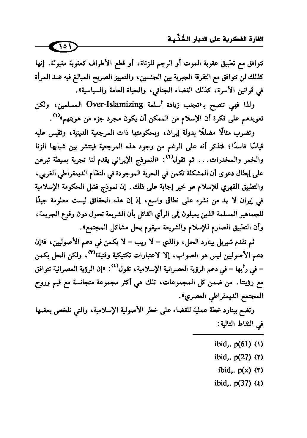 وتضرب مثالًا مضللًا بدولة إيران، وبحكومتها ذات المرجعية الدينية، وتقيس عليه قياسًا فاسدًا؛ فتذكر أنه على الرغم من وجود هذه المرجعية فينتشر بين شبابها الزنا والخمر والمخدرات ... ثم تقول (¬2): «النموذج الإيراني يقدم لنا تجربة بسيطة تبرهن على إبطال دعوى أن المشكلة تكمن في الحرية الموجودة في النظام الديمقراطي الغربي، والتطبيق القهري للإسلام هو خير إجابة على ذلك. إن نموذج فشل الحكومة الإسلامية في إيران لا بد من نشره على نطاق واسع، إذ إن هذه الحقائق ليست معلومة جيدًا للجماهير المسلمة الذين يميلون إلى الرأي القائل بأن الشريعة تحول دون وقوع الجريمة، وأن التطبيق الصارم للإسلام والشريعة سيقوم بحل مشاكل المجتمع».