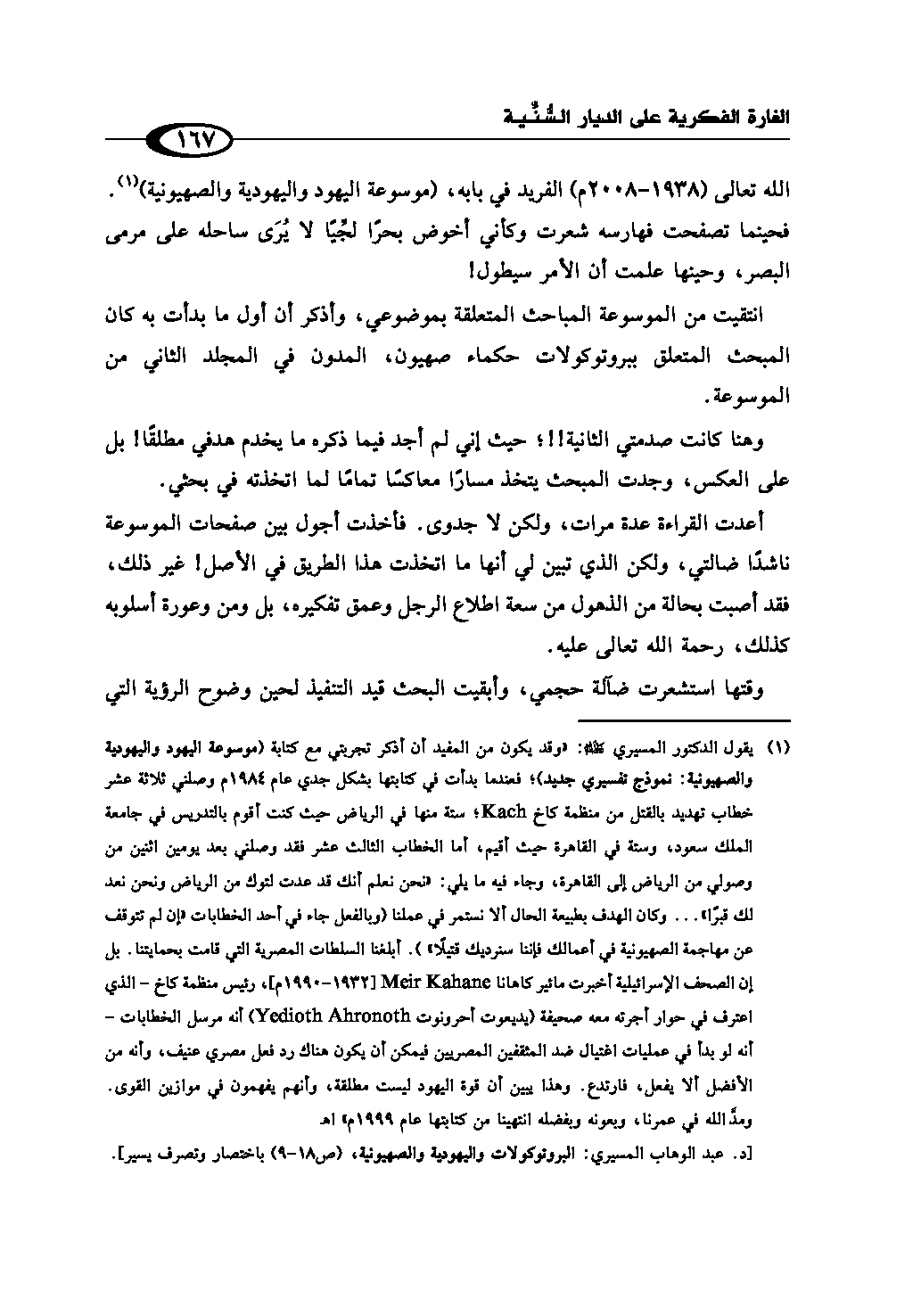 (¬1) يقول الدكتور المسيري رحمه الله: «وقد يكون من المفيد أن أذكر تجربتي مع كتابة (موسوعة اليهود واليهودية والصهيونية: نموذج تفسيري جديد)؛ فعندما بدأت في كتابتها بشكل جدي عام 1984م وصلني ثلاثة عشر خطاب تهديد بالقتل من منظمة كاخ Kach؛ ستة منها في الرياض حيث كنت أقوم بالتدريس في جامعة الملك سعود، وستة في القاهرة حيث أقيم، أما الخطاب الثالث عشر فقد وصلني بعد يومين اثنين من وصولي من الرياض إلى القاهرة، وجاء فيه ما يلي: "نحن نعلم أنك قد عدت لتوك من الرياض ونحن نعد لك قبرًا" ... وكان الهدف بطبيعة الحال ألا نستمر في عملنا (وبالفعل جاء في أحد الخطابات "إن لم تتوقف عن مهاجمة الصهيونية في أعمالك فإننا سنرديك قتيلًا"). أبلغنا السلطات المصرية التي قامت بحمايتنا. بل إن الصحف الإسرائيلية أخبرت مائير كاهانا Meir Kahane [1932 - 1990 م]، رئيس منظمة كاخ - الذي اعترف في حوار أجرته معه صحيفة (يديعوت أحرونوت Yedioth Ahronoth) أنه مرسل الخطابات - أنه لو بدأ في عمليات اغتيال ضد المثقفين المصريين فيمكن أن يكون هناك رد فعل مصري عنيف، وأنه من الأفضل ألا يفعل، فارتدع. وهذا يبين أن قوة اليهود ليست مطلقة، وأنهم يفهمون في موازين القوى. ومدَّ الله في عمرنا، وبعونه وبفضله انتهينا من كتابتها عام 1999م» اهـ[د. عبد الوهاب المسيري: الپروتوكولات واليهودية والصهيونية، ص (18 - 9) باختصار وتصرف يسير].
