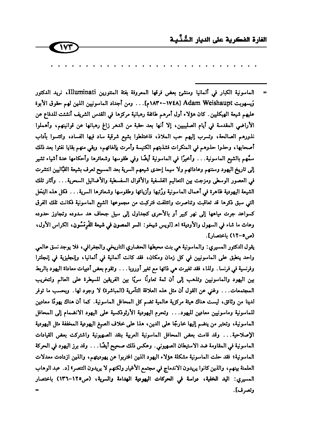 = الماسونية الكبار في ألمانيا ومنشئ بعض فرقها المعروفة بفئة المتنورين Illuminati، نريد الدكتور وَيسهوپت Adam Weishaupt [1748 - 1830 م] ... ومن أجداد الماسونيين الذين لهم حقوق الأبوة عليهم شيعة الهيكليين. كان هؤلاء أول أمرهم طائفة رهبانية مركزها في القدس الشريف أنشئت للدفاع عن الأراضي المقدسة في أيام الصليبيين، إلا أنها بعد حقبة من الدهر زاغ رهبانها عن قوانينهم، وأهملوا نذورهم الصالحة، وتسرب إليهم حب الملاذ، فاختلطوا بشيع شرقية ساد فيها الفساد، وائتسوا بآداب أصحابها، وحذوا حذوهم في المنكرات فشذبتهم الكنيسة وأمرت بإلغائهم، وبقي منهم بقايا نفثوا بعد ذلك سمَّهم بالشيع الماسونية ... وأخيرًا في الماسونية أيضًا وفي طقوسها وشعائرها وأحكامها عدة أشياء تشير إلى تاريخ اليهود وسننهم وعاداتهم ولا سيما إحدى شيعهم السرية بعد المسيح تعرف بشيعة القبَّاليين انتشرت في العصور الوسطى ومزجت بين التعاليم الفلسفية والأقوال السفسطية والأضاليل السحرية ... وآثار تلك الشيعة اليهودية ظاهرة في أعمال الماسونية ورُتبها وأزيائها وطقوسها وشعائرها السرية ... فكل هذه النِحَل التي سبق ذكرها قد تعاقبت وتناصرت وائتلفت فتركبت من مجموعها الشيع الماسونية فكانت تلك الفرق كسواعد جرت مياهها إلى نهر كبير أو بالأحرى كجداول إلى سيل جحاف هد سدوده وتجاوز حدوده وعاث ما شاء في السهول والأودية» اهـ[لويس شيخو: السر المصون في شيعة الفْرِمَسُون، الكراس الأول، ص (5 - 12) باختصار]. يقول الدكتور المسيري: «والماسونية هي بنت محيطها الحضاري التاريخي والجغرافي، فلا يوجد نسق عالمي واحد ينطبق على الماسونيين في كل زمان ومكان، فقد كانت ألمانية في ألمانيا، وإنجليزية في إنجلترا وفرنسية في فرنسا. ولذا، فقد تغيرت هي ذاتها مع تغير أوروپا ... وتقوم بعض أدبيات معاداة اليهود بالربط بين اليهود والماسونيين وتذهب إلى أن ثمة تعاونًا سريًا بين الفريقين للسيطرة على العالم ولتخريب المجتمعات ... وغني عن القول أن مثل هذه العلاقة التآمرية (المباشرة) لا وجود لها. وبحسب ما توفر لدينا من وثائق، ليست هناك هيئة مركزية عالمية تضم كل المحافل الماسونية. كما أن هناك يهودًا معادين للماسونية وماسونيين معادين لليهود ... وتحرم اليهودية الأرثوذكسية على اليهود الانضمام إلى المحافل الماسونية، وتعتبر من ينضم إليها خارجًا على الدين، هذا على خلاف الصيغ اليهودية المخففة مثل اليهودية الإصلاحية ... وقد قامت بعض المحافل الماسونية العربية بنقد الصهيونية واشتركت بعض القيادات الماسونية في المقاومة ضد الاستيطان الصهيوني. وعكس ذلك صحيح أيضًا ... وقد برز اليهود في الحركة الماسونية؛ فقد حلت الماسونية مشكلة هؤلاء اليهود الذين اغتربوا عن يهوديتهم، والذين ازدادت معدلات العلمنة بينهم، والذين كانوا يريدون الاندماج في مجتمع الأغيار ولكنهم لا يريدون التنصر» [د. عبد الوهاب المسيري: اليد الخفية، دراسة في الحركات اليهودية الهدامة والسرية، ص (125 - 136) باختصار وتصرف]. =