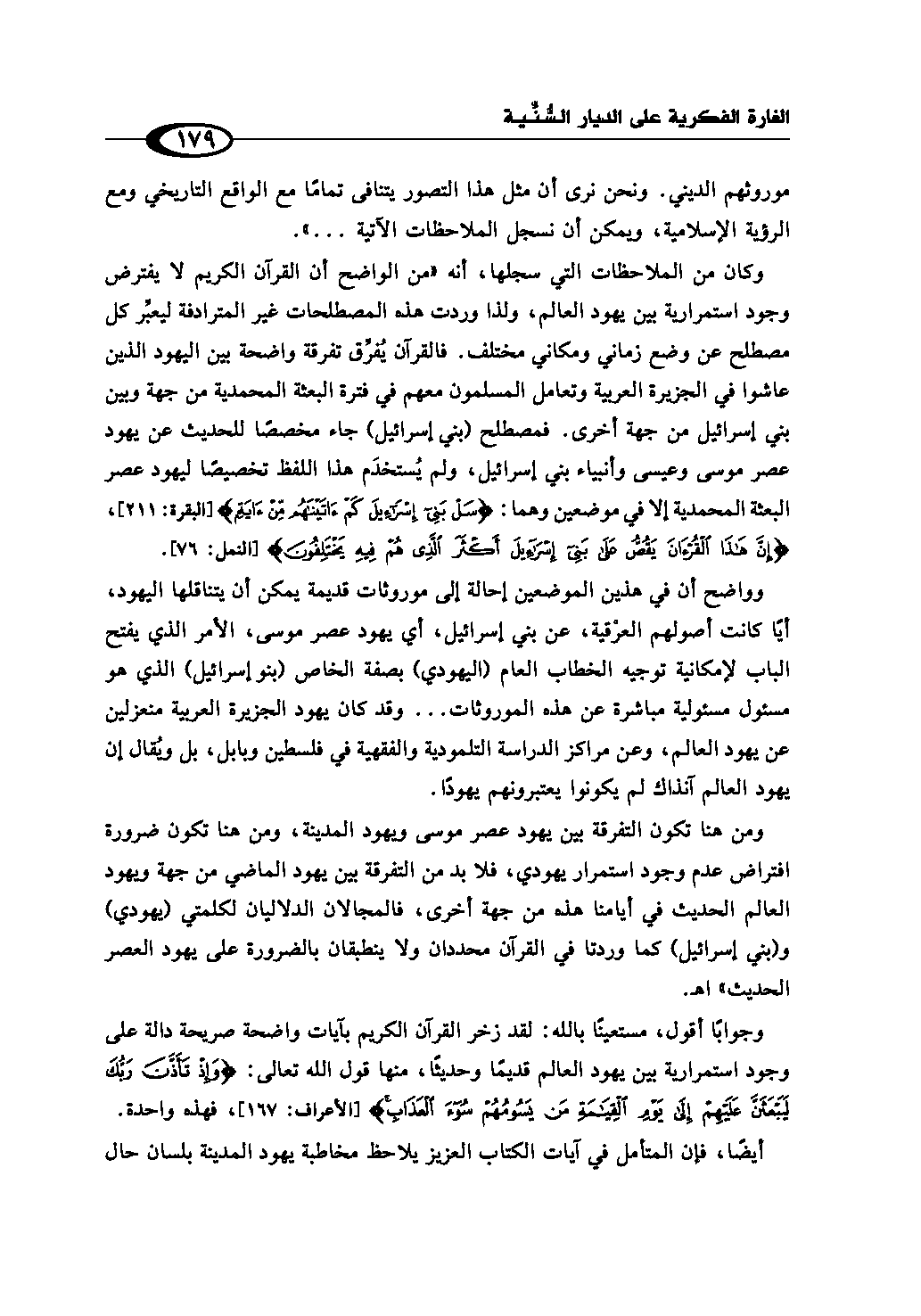 ومن هنا تكون التفرقة بين يهود عصر موسى ويهود المدينة، ومن هنا تكون ضرورة افتراض عدم وجود استمرار يهودي، فلا بد من التفرقة بين يهود الماضي من جهة ويهود العالم الحديث في أيامنا هذه من جهة أخرى، فالمجالان الدلاليان لكلمتي (يهودي) و (بني إسرائيل) كما وردتا في القرآن محددان ولا ينطبقان بالضرورة على يهود العصر الحديث» اهـ.
