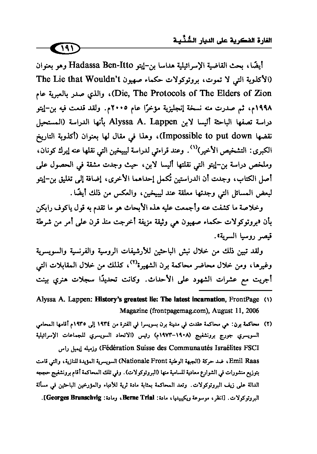 (¬2) محاكمة برن: هي محاكمة عقدت في مدينة برن بسويسرا في الفترة من 1934 إلى 1935م أقامها المحامي السويسري چورچ برونشفيج (1908 - 1973م) رئيس (الاتحاد السويسري للجماعات الإسرائيلية Fédération Suisse des Communautés Israélites FSCI) وزميله إيميل راس Emil Raas، ضد حركة (الجبهة الوطنية Nationale Front) السويسرية المؤيدة للنازية، والتي قامت بتوزيع منشورات في الشوارع معادية للسامية منها (الپروتوكولات). وفي تلك المحاكمة أقام برونشفيج حججه الدالة على زيف الپروتوكولات. وتعد المحاكمة بمثابة مادة ثرية للأدباء والمؤرخين الباحثين في مسألة الپروتوكولات. [انظر، موسوعة ويكيپيديا، مادة: Berne Trial، ومادة: Georges Brunschvig].