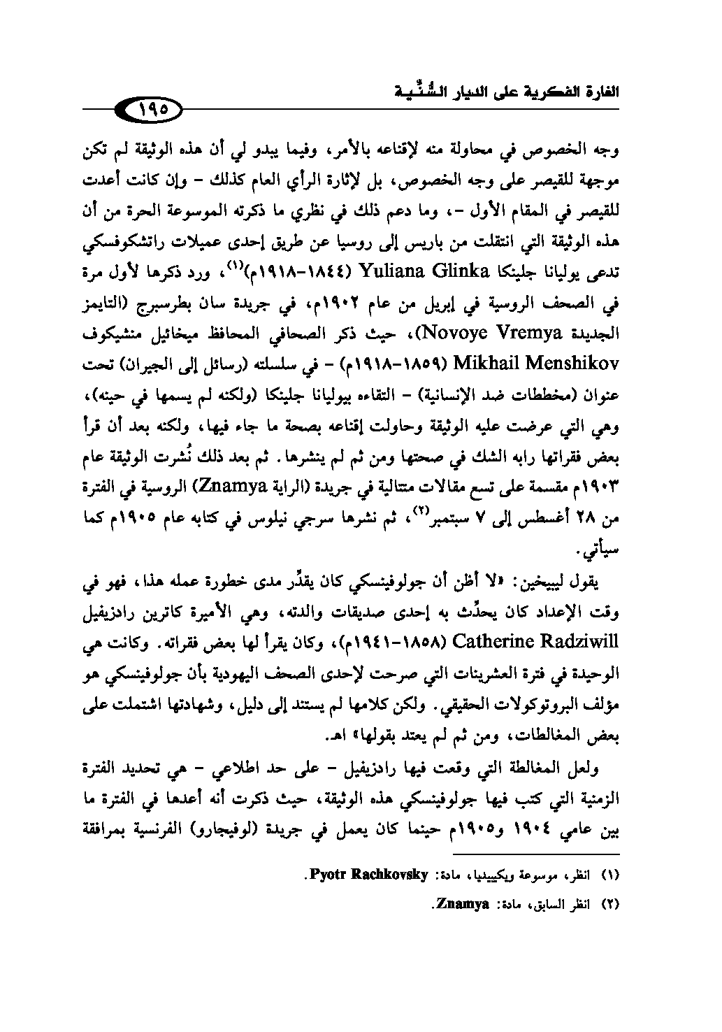 وجه الخصوص في محاولة منه لإقناعه بالأمر، وفيما يبدو لي أن هذه الوثيقة لم تكن موجهة للقيصر على وجه الخصوص، بل لإثارة الرأي العام كذلك - وإن كانت أعدت للقيصر في المقام الأول -، وما دعم ذلك في نظري ما ذكرته الموسوعة الحرة من أن هذه الوثيقة التي انتقلت من پاريس إلى روسيا عن طريق إحدى عميلات راتشكوفسكي تدعى يوليانا جلينكا Yuliana Glinka (1844 - 1918 م) (¬1)، ورد ذكرها لأول مرة في الصحف الروسية في إپريل من عام 1902م، في جريدة سان بطرسبرج (التايمز الجديدة Novoye Vremya)، حيث ذكر الصحافي المحافظ ميخائيل منشيكوف Mikhail Menshikov (1859 - 1918 م) - في سلسلته (رسائل إلى الجيران) تحت عنوان (مخططات ضد الإنسانية) - التقاءه بيوليانا جلينكا (ولكنه لم يسمها في حينه)، وهي التي عرضت عليه الوثيقة وحاولت إقناعه بصحة ما جاء فيها، ولكنه بعد أن قرأ بعض فقراتها رابه الشك في صحتها ومن ثم لم ينشرها. ثم بعد ذلك نُشرت الوثيقة عام 1903م مقسمة على تسع مقالات متتالية في جريدة (الراية Znamya) الروسية في الفترة من 28 أغسطس إلى 7 سپتمبر (¬2)، ثم نشرها سرچي نيلوس في كتابه عام 1905م كما سيأتي.