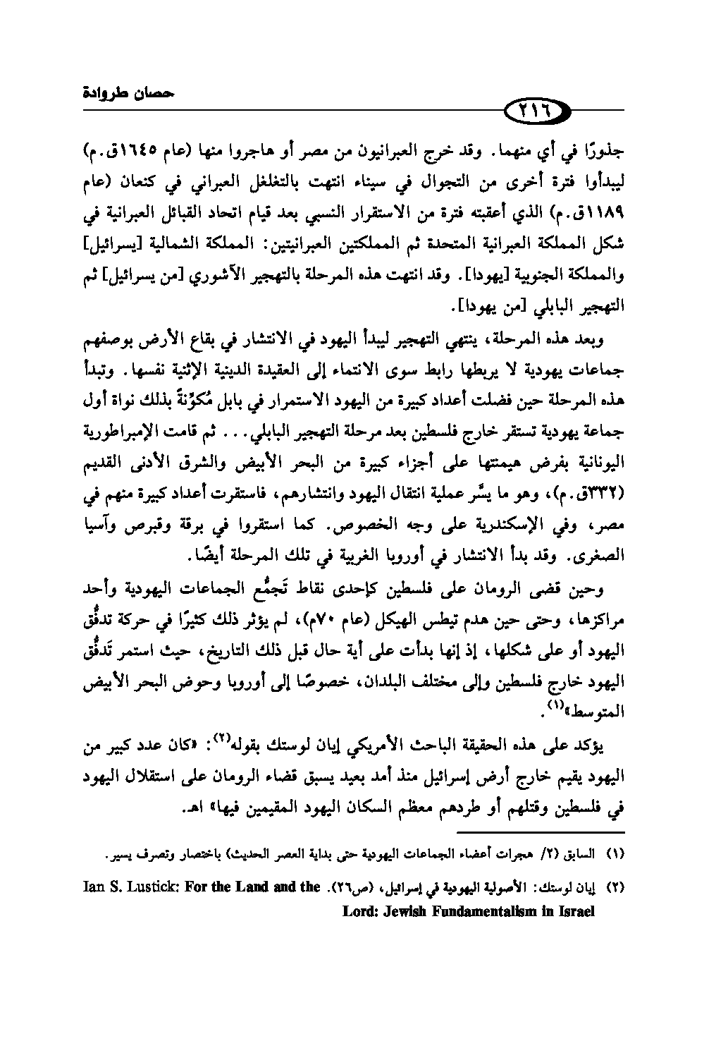 (¬2) إيان لوستك: الأصولية اليهودية في إسرائيل، ص (26). Ian S. Lustick: For the Land and the Lord: Jewish Fundamentalism in Israel