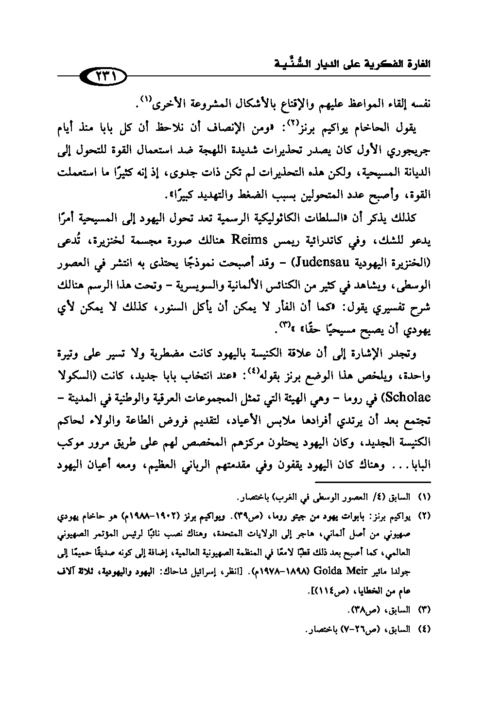 (¬2) يواكيم پرنز: بابوات يهود من جيتو روما، ص (39). ويواكيم پرنز (1902 - 1988م) هو حاخام يهودي صهيوني من أصل ألماني، هاجر إلى الولايات المتحدة، وهناك نصب نائبًا لرئيس المؤتمر الصهيوني العالمي، كما أصبح بعد ذلك قطبًا لامعًا في المنظمة الصهيونية العالمية، إضافة إلى كونه صديقًا حميمًا إلى جولدا مائير Golda Meir (1898 - 1978 م). [انظر، إسرائيل شاحاك: اليهود واليهودية، ثلاثة آلاف عام من الخطايا، ص (114)].