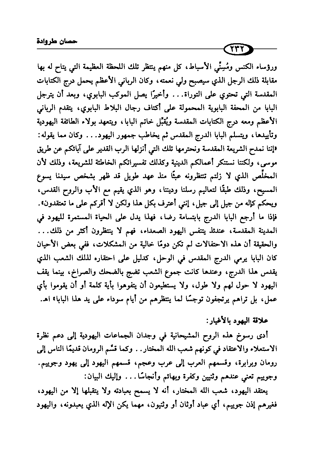 ورؤساء الكنس ومُسِنِّي الأسباط، كل منهم ينتظر تلك اللحظة العظيمة التي يتاح له بها مقابلة ذلك الرجل الذي سيصبح ولي نعمته، وكان الرباني الأعظم يحمل درج الكتابات المقدسة التي تحتوي على التوراة ... وأخيرًا يصل الموكب البابوي، وبعد أن يترجل البابا من المحفة البابوية المحمولة على أكتاف رجال البلاط البابوي، يتقدم الرباني الأعظم ومعه درج الكتابات المقدسة ويُقَبِّل خاتم البابا، ويتعهد بولاء الطائفة اليهودية وتأييدها، ويتسلم البابا الدرج المقدس ثم يخاطب جمهور اليهود ... وكان مما يقوله: "إننا نمدح الشريعة المقدسة ونحترمها تلك التي أنزلها الرب القدير على آبائكم عن طريق موسى، ولكننا نستنكر أعمالكم الدينية وكذلك تفسيراتكم الخاطئة للشريعة، وذلك لأن المخلِّص الذي لا زلتم تنتظرونه عبثًا منذ عهد طويل قد ظهر بشخص سيدنا يسوع المسيح، وذلك طبقًا لتعاليم رسلنا وديننا، وهو الذي يقيم مع الأب والروح القدس، ويحكم كإله من جيل إلى جيل، إنني أعترف بكل هذا ولكن لا أقركم على ما تعتقدون". فإذا ما أرجع البابا الدرج بابتسامة رضا، فهذا يدل على الحياة المستمرة لليهود في المدينة المقدسة، عندئذ يتنفس اليهود الصعداء، فهم لا ينتظرون أكثر من ذلك ...