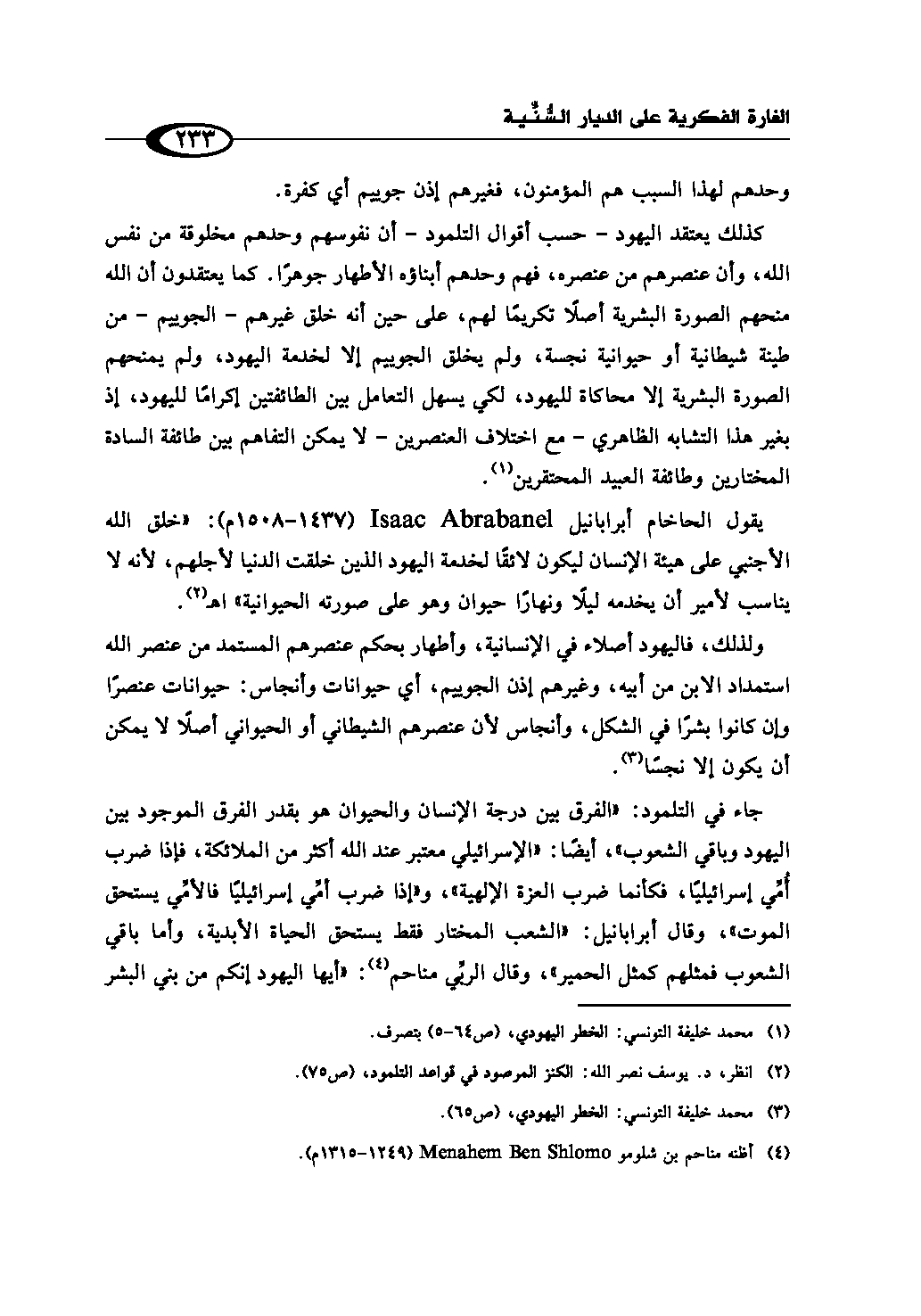 ولذلك، فاليهود أصلاء في الإنسانية، وأطهار بحكم عنصرهم المستمد من عنصر الله استمداد الابن من أبيه، وغيرهم إذن الجوييم، أي حيوانات وأنجاس: حيوانات عنصرًا وإن كانوا بشرًا في الشكل، وأنجاس لأن عنصرهم الشيطاني أو الحيواني أصلًا لا يمكن أن يكون إلا نجسًا (¬3).