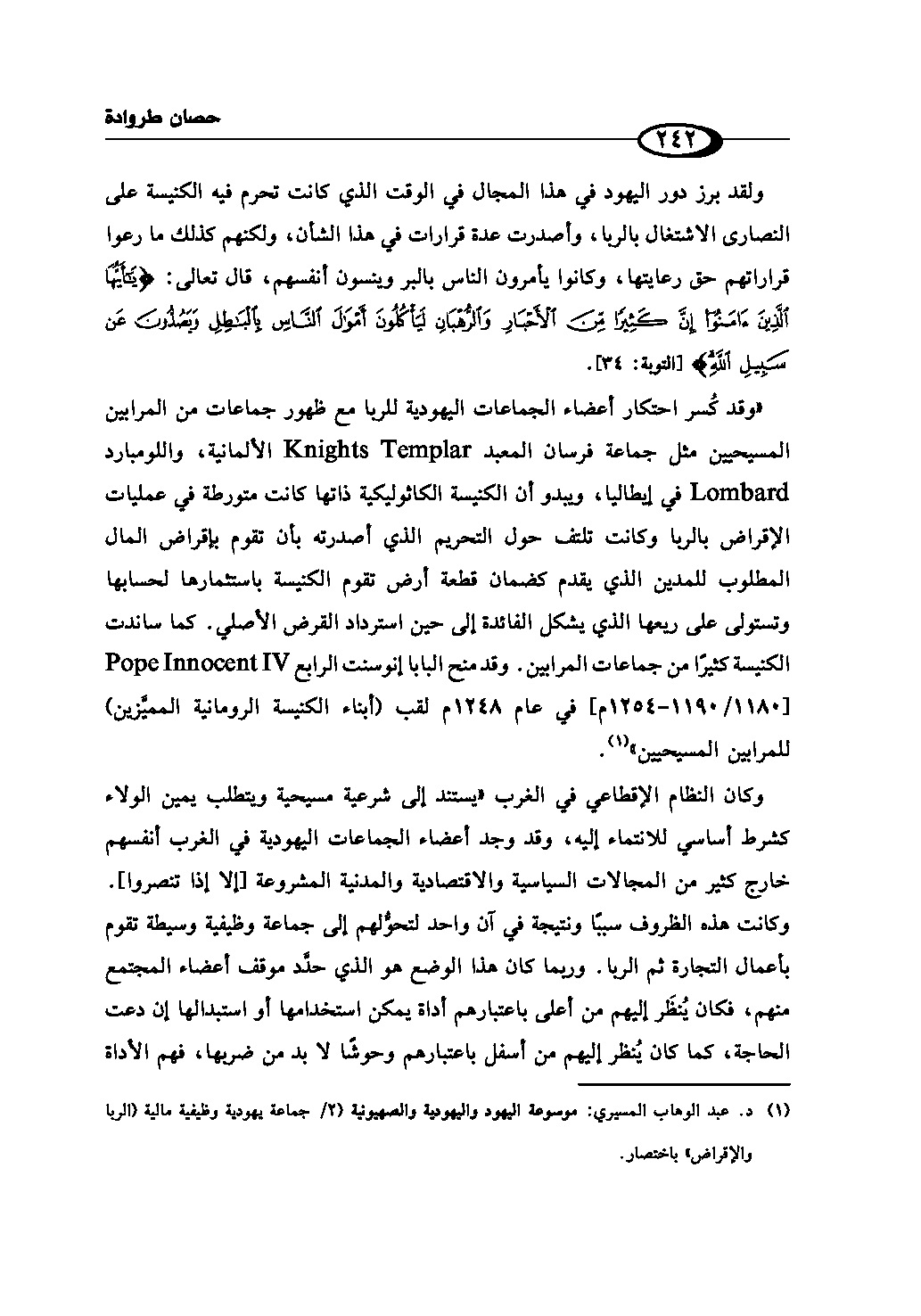 «وقد كُسر احتكار أعضاء الجماعات اليهودية للربا مع ظهور جماعات من المرابين المسيحيين مثل جماعة فرسان المعبد Knights Templar الألمانية، واللومبارد Lombard في إيطاليا، ويبدو أن الكنيسة الكاثوليكية ذاتها كانت متورطة في عمليات الإقراض بالربا وكانت تلتف حول التحريم الذي أصدرته بأن تقوم بإقراض المال المطلوب للمدين الذي يقدم كضمان قطعة أرض تقوم الكنيسة باستثمارها لحسابها وتستولى على ريعها الذي يشكل الفائدة إلى حين استرداد القرض الأصلي. كما ساندت الكنيسة كثيرًا من جماعات المرابين. وقد منح البابا إنوسنت الرابع Pope Innocent IV [1180/ 1190 - 1254 م] في عام 1248م لقب (أبناء الكنيسة الرومانية المميَّزين) للمرابين المسيحيين» (¬2).