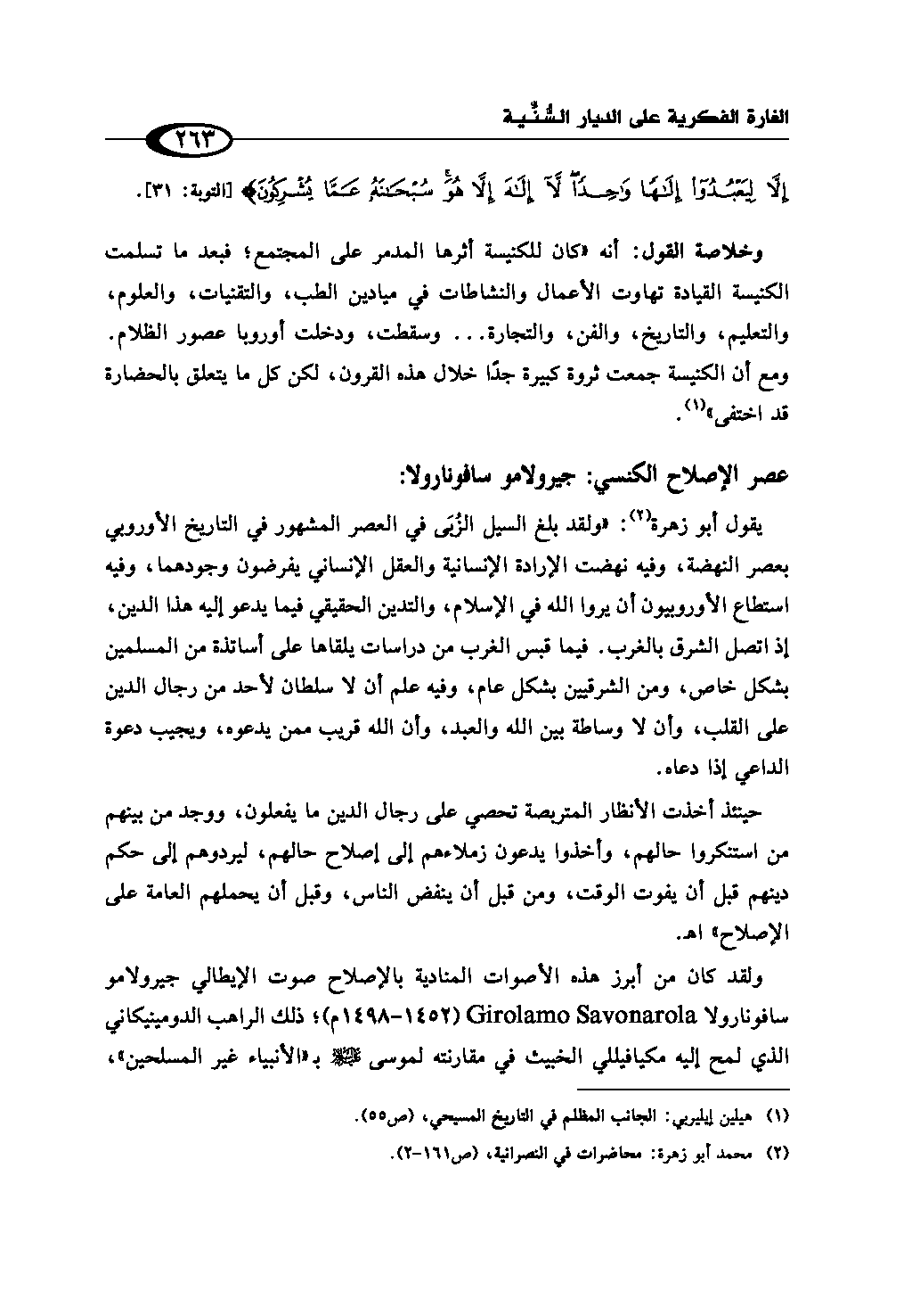 يقول أبو زهرة (¬3): «ولقد بلغ السيل الزُبَى في العصر المشهور في التاريخ الأوروپي بعصر النهضة، وفيه نهضت الإرادة الإنسانية والعقل الإنساني يفرضون وجودهما، وفيه استطاع الأوروپيون أن يروا الله في الإسلام، والتدين الحقيقي فيما يدعو إليه هذا الدين، إذ اتصل الشرق بالغرب. فيما قبس الغرب من دراسات يلقاها على أساتذة من المسلمين بشكل خاص، ومن الشرقيين بشكل عام، وفيه علم أن لا سلطان لأحد من رجال الدين على القلب، وأن لا وساطة بين الله والعبد، وأن الله قريب ممن يدعوه، ويجيب دعوة الداعي إذا دعاه.