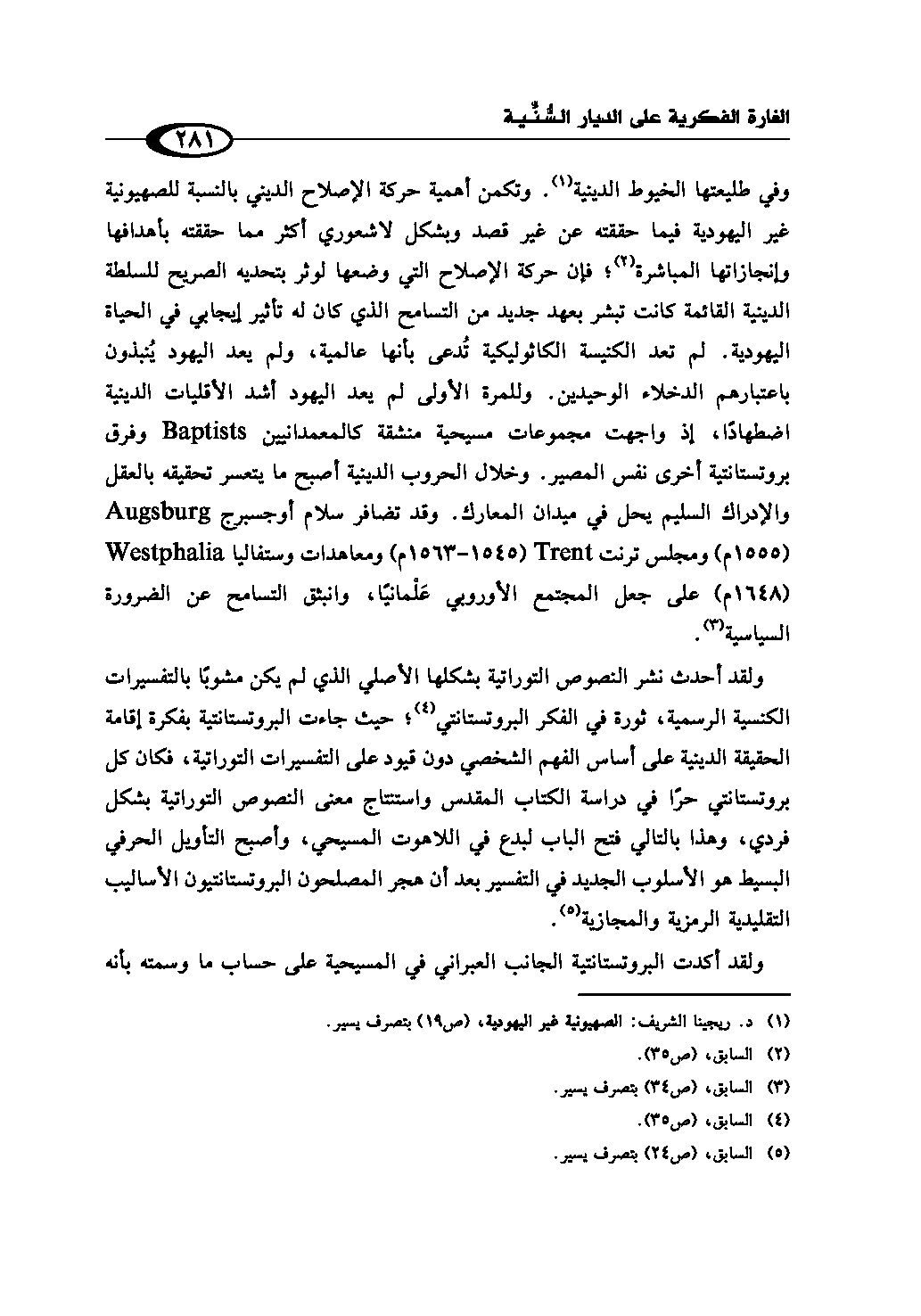 وفي طليعتها الخيوط الدينية (¬1). وتكمن أهمية حركة الإصلاح الديني بالنسبة للصهيونية غير اليهودية فيما حققته عن غير قصد وبشكل لاشعوري أكثر مما حققته بأهدافها وإنجازاتها المباشرة (¬2)؛ فإن حركة الإصلاح التي وضعها لوثر بتحديه الصريح للسلطة الدينية القائمة كانت تبشر بعهد جديد من التسامح الذي كان له تأثير إيجابي في الحياة اليهودية. لم تعد الكنيسة الكاثوليكية تُدعى بأنها عالمية، ولم يعد اليهود يُنبذون باعتبارهم الدخلاء الوحيدين. وللمرة الأولى لم يعد اليهود أشد الأقليات الدينية اضطهادًا، إذ واجهت مجموعات مسيحية منشقة كالمعمدانيين Baptists وفرق پروتستانتية أخرى نفس المصير. وخلال الحروب الدينية أصبح ما يتعسر تحقيقه بالعقل والإدراك السليم يحل في ميدان المعارك. وقد تضافر سلام أوجسبرج Augsburg (1555 م) ومجلس ترنت Trent (1545 - 1563 م) ومعاهدات وستفاليا Westphalia (1648 م) على جعل المجتمع الأوروپي عَلْمانيًا، وانبثق التسامح عن الضرورة السياسية (¬3).