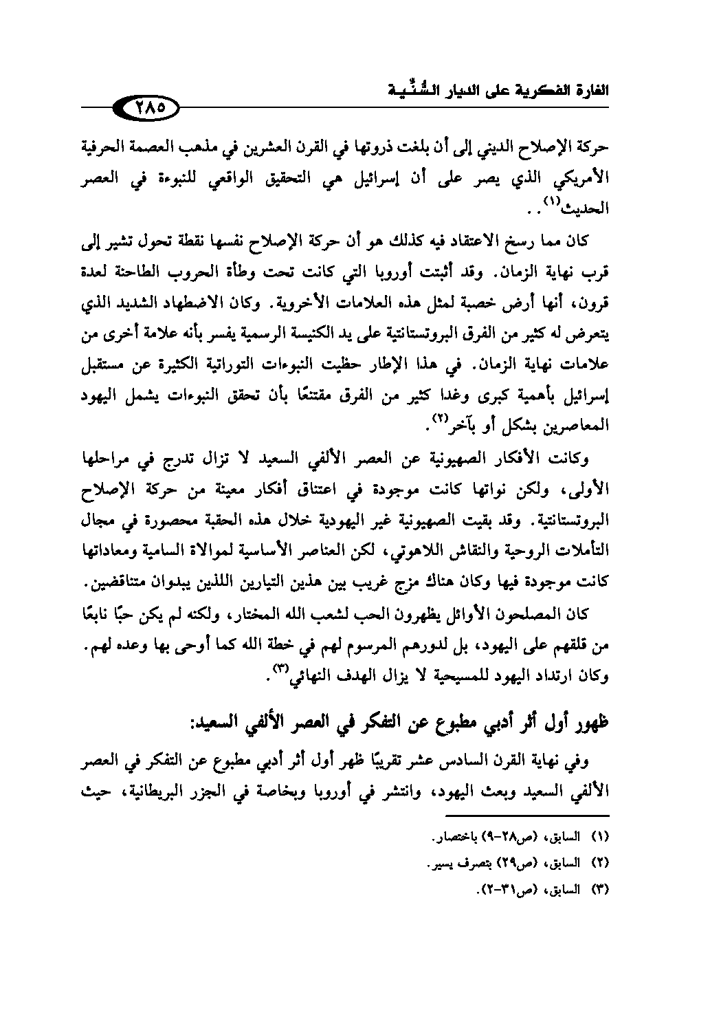 حركة الإصلاح الديني إلى أن بلغت ذروتها في القرن العشرين في مذهب العصمة الحرفية الأمريكي الذي يصر على أن إسرائيل هي التحقيق الواقعي للنبوءة في العصر الحديث (¬1) ..