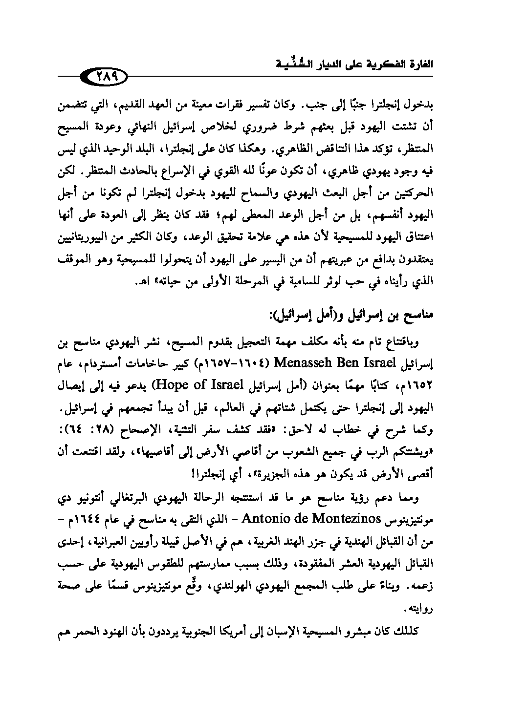 وباقتناع تام منه بأنه مكلف مهمة التعجيل بقدوم المسيح، نشر اليهودي مناسح بن إسرائيل Menasseh Ben Israel (1604 - 1657 م) كبير حاخامات أمستردام، عام 1652م، كتابًا مهمًا بعنوان (أمل إسرائيل Hope of Israel) يدعو فيه إلى إيصال اليهود إلى إنجلترا حتى يكتمل شتاتهم في العالم، قبل أن يبدأ تجمعهم في إسرائيل. وكما شرح في خطاب له لاحق: «فقد كشف سفر التثنية، الإصحاح (28: 64): "ويشتتكم الرب في جميع الشعوب من أقاصي الأرض إلى أقاصيها"، ولقد اقتنعت أن أقصى الأرض قد يكون هو هذه الجزيرة»، أي إنجلترا!