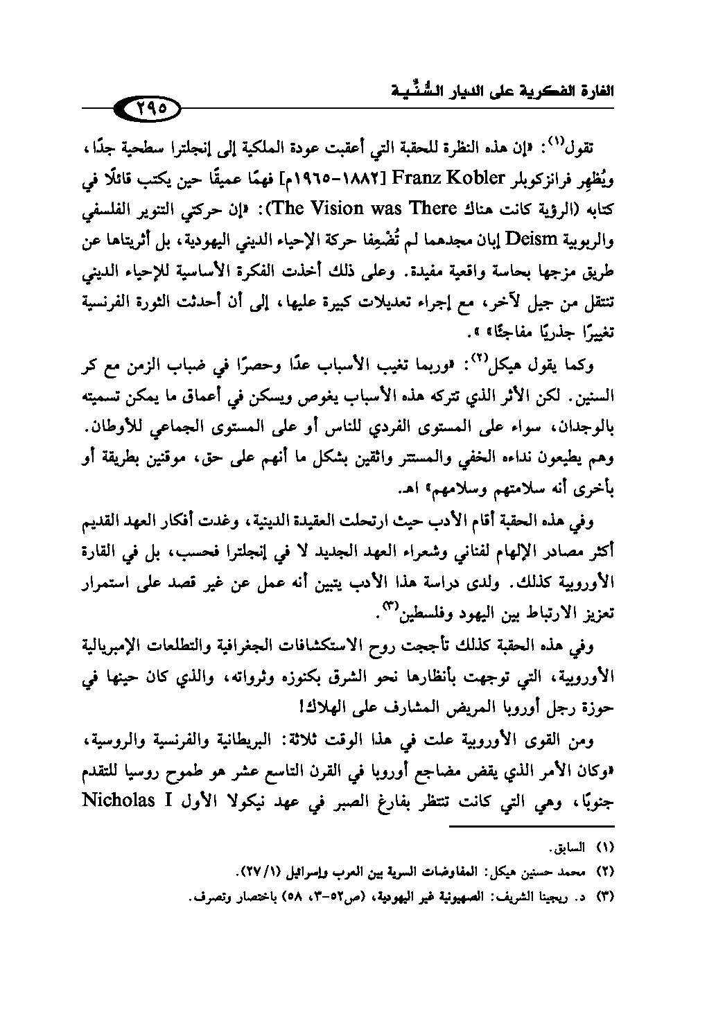 تقول (¬1): «إن هذه النظرة للحقبة التي أعقبت عودة الملكية إلى إنجلترا سطحية جدًا، ويُظهِر فرانزكوبلر Franz Kobler [1882 - 1965 م] فهمًا عميقًا حين يكتب قائلًا في كتابه (الرؤية كانت هناك The Vision was There): " إن حركتي التنوير الفلسفي والربوبية Deism إبان مجدهما لم تُضْعِفا حركة الإحياء الديني اليهودية، بل أثريتاها عن طريق مزجها بحاسة واقعية مفيدة. وعلى ذلك أخذت الفكرة الأساسية للإحياء الديني تنتقل من جيل لآخر، مع إجراء تعديلات كبيرة عليها، إلى أن أحدثت الثورة الفرنسية تغييرًا جذريًا مفاجئًا"».