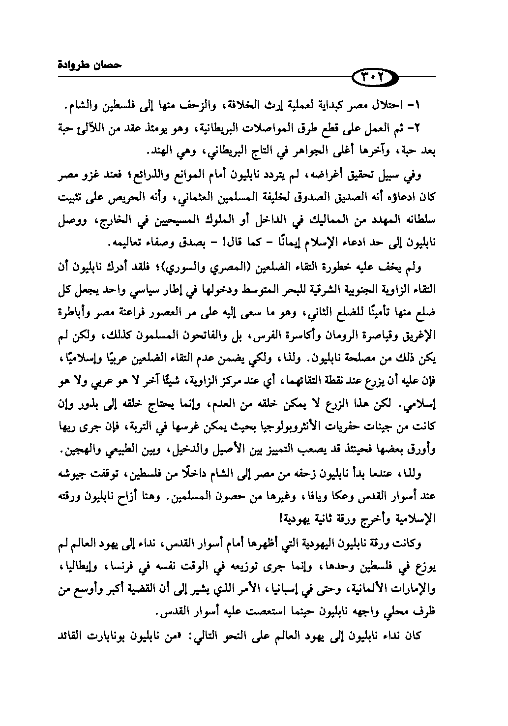 ولم يخف عليه خطورة التقاء الضلعين (المصري والسوري)؛ فلقد أدرك ناپليون أن التقاء الزاوية الجنوبية الشرقية للبحر المتوسط ودخولها في إطار سياسي واحد يجعل كل ضلع منها تأمينًا للضلع الثاني، وهو ما سعى إليه على مر العصور فراعنة مصر وأباطرة الإغريق وقياصرة الرومان وأكاسرة الفرس، بل والفاتحون المسلمون كذلك، ولكن لم يكن ذلك من مصلحة ناپليون. ولذا، ولكي يضمن عدم التقاء الضلعين عربيًا وإسلاميًا، فإن عليه أن يزرع عند نقطة التقائهما، أي عند مركز الزاوية، شيئًا آخر لا هو عربي ولا هو إسلامي. لكن هذا الزرع لا يمكن خلقه من العدم، وإنما يحتاج خلقه إلى بذور وإن كانت من چينات حفريات الأنثروپولوچيا بحيث يمكن غرسها في التربة، فإن جرى ريها وأورق بعضها فحينئذ قد يصعب التمييز بين الأصيل والدخيل، وبين الطبيعي والهجين.