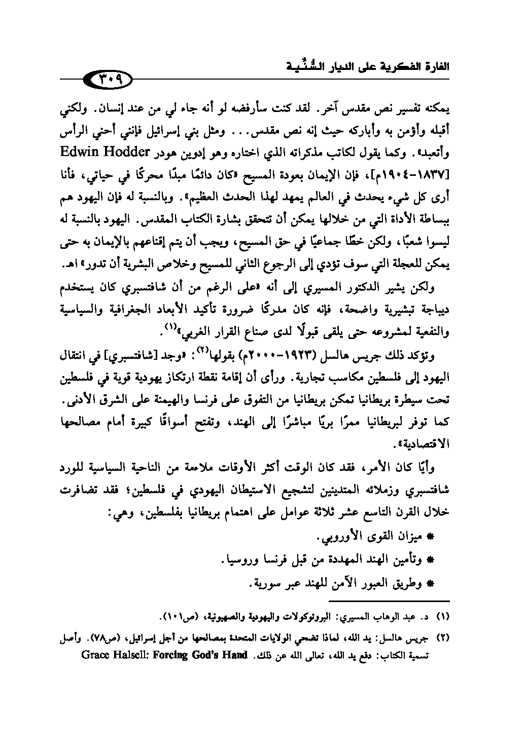 (¬2) جريس هالسل: يد الله، لماذا تضحي الولايات المتحدة بمصالحها من أجل إسرائيل، ص (78). وأصل تسمية الكتاب: دفع يد الله، تعالى الله عن ذلك. Grace Halsell: Forcing God's Hand