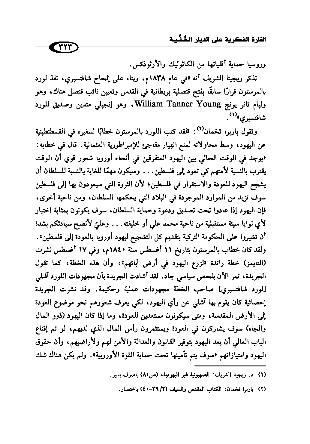 وتقول باربرا تخمان (¬2): «لقد كتب اللورد پالمرستون خطابًا لسفيره في القسطنطينية عن اليهود، وسط محاولاته لمنع انهيار مفاجئ للإمپراطورية العثمانية. قال في خطابه: "يوجد في الوقت الحالي بين اليهود المتفرقين في أنحاء أوروپاشعور قوي أن الوقت يقترب بالنسبة لأمتهم كي تعود إلى فلسطين ... وسيكون مهمًا للغاية بالنسبة للسلطان أن يشجع اليهود للعودة والاستقرار في فلسطين؛ لأن الثروة التي سيعودون بها إلى فلسطين سوف تزيد من الموارد الموجودة في البلاد التي يحكمها السلطان، ومن ناحية أخرى، فإن اليهود إذا عادوا تحت تصديق ودعوة وحماية السلطان، سوف يكونون بمثابة اختبار لأي نوايا سيئة مستقبلية من ناحية محمد علي أو خليفته ... وعليّ لأنصح سيادتكم بشدة أن تشيروا على الحكومة التركية بتقديم كل التشجيع ليهود أوروپابالعودة إلى فلسطين". ولقد كان خطاب پالمرستون بتاريخ 11 أغسطس سنة 1840م، وفي 17 أغسطس نشرت (التايمز) خطة رائدة "لزرع اليهود في أرض آبائهم"، وأن هذه الخطة، كما تقول الجريدة، تمر الآن بفحص سياسي جاد. لقد أشادت الجريدة بأن مجهودات اللورد آشلي [لورد شافتسبري] صاحب الخطة مجهودات عملية وحكيمة. وقد نشرت الجريدة إحصائية كان يقوم بها آشلي عن رأي اليهود، لكي يعرف شعورهم نحو موضوع العودة إلى الأرض المقدسة، ومتى سيكونون مستعدين للعودة، وما إذا كان اليهود (ذوو المال والجاه) سوف يشاركون في العودة ويستثمرون رأس المال الذي لديهم، لو تم إقناع الباب العالي أن يعد اليهود بتوفير القانون والعدالة والأمن لهم ولأراضيهم، وأن حقوق اليهود وامتيازاتهم "سوف يتم تأمينها تحت حماية القوة الأوروپية". ولم يكن هناك شك