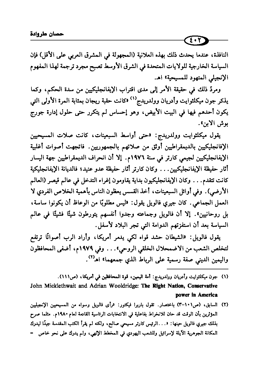 (¬1) چون ميكلثوايت وأدريان وولدريدچ: أمة اليمين، قوة المحافظين في أمريكا، ص (111). John Micklethwait and Adrian Wooldridge: The Right Nation, Conservative Power in America