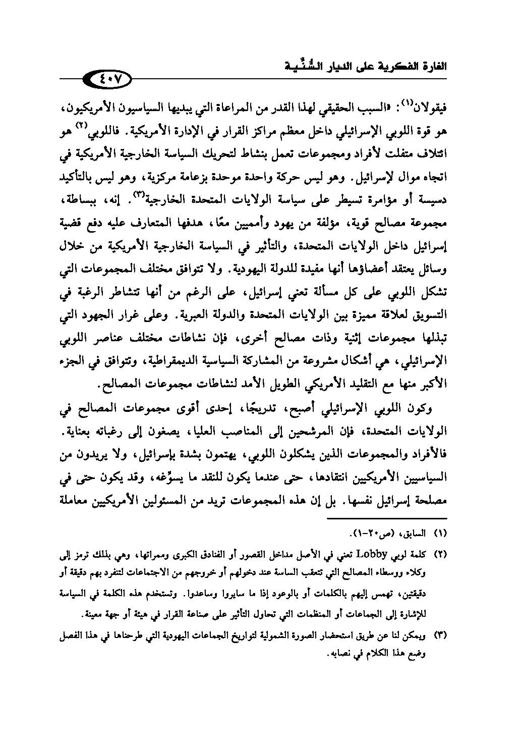(¬2) كلمة لوبي Lobby تعني في الأصل مداخل القصور أو الفنادق الكبرى وممراتها، وهي بذلك ترمز إلى وكلاء ووسطاء المصالح التي تتعقب الساسة عند دخولهم أو خروجهم من الاجتماعات لتنفرد بهم دقيقة أو دقيقتين، تهمس إليهم بالكلمات أو بالوعود إذا ما سايروا وساعدوا. وتستخدم هذه الكلمة في السياسة للإشارة إلى الجماعات أو المنظمات التي تحاول التأثير على صناعة القرار في هيئة أو جهة معينة.