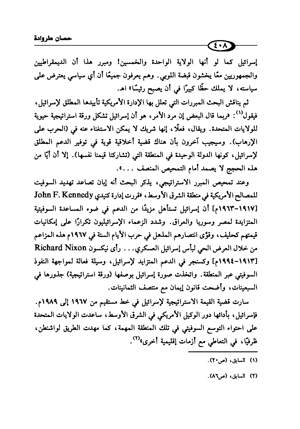 سارت قضية القيمة الاستراتيچية لإسرائيل في خط مستقيم من 1967 إلى 1989م. فإسرائيل، بأدائها دور الوكيل الأمريكي في الشرق الأوسط، ساعدت الولايات المتحدة على احتواء التوسع السوفيتي في تلك المنطقة المهمة، كما مهدت الطريق لواشنطن، ظرفيًا، في التعاطي مع أزمات إقليمية أخرى» (¬2).
