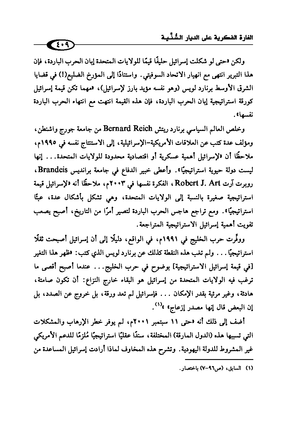 ووفَّرت حرب الخليج في 1991م، في الواقع، دليلًا إلى أن إسرائيل أصبحت ثقلًا استراتيچيًا ... ولم تغب هذه النقطة كذلك عن برنارد لويس الذي كتب: "ظهر هذا التغير [في قيمة إسرائيل الاستراتيچية] بوضوح في حرب الخليج ... عندما أصبح أقصى ما ترغب فيه الولايات المتحدة من إسرائيل هو البقاء خارج النزاع: أن تكون صامتة، هادئة، وغير مرئية بقدر الإمكان ... فإسرائيل لم تعد ورقة، بل خروج عن الصدد، بل إن البعض قال إنها مصدر إزعاج"» (¬1).