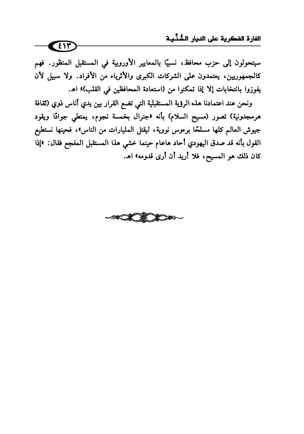 ونحن عند اعتمادنا هذه الرؤية المستقبلية التي تضع القرار بين يدي أناس ذوي (ثقافة هرمجدونية) تصور (مسيح السلام) بأنه «چنرال بخمسة نجوم، يمتطي جوادًا ويقود جيوش العالم كلها مسلحًا برءوس نووية، ليقتل المليارات من الناس»، فحينها نستطيع القول بأنه قد صدق اليهودي أحاد هاعام حينما خشي هذا المستقبل المفجع فقال: «إذا كان ذلك هو المسيح، فلا أريد أن أرى قدومه» اهـ.