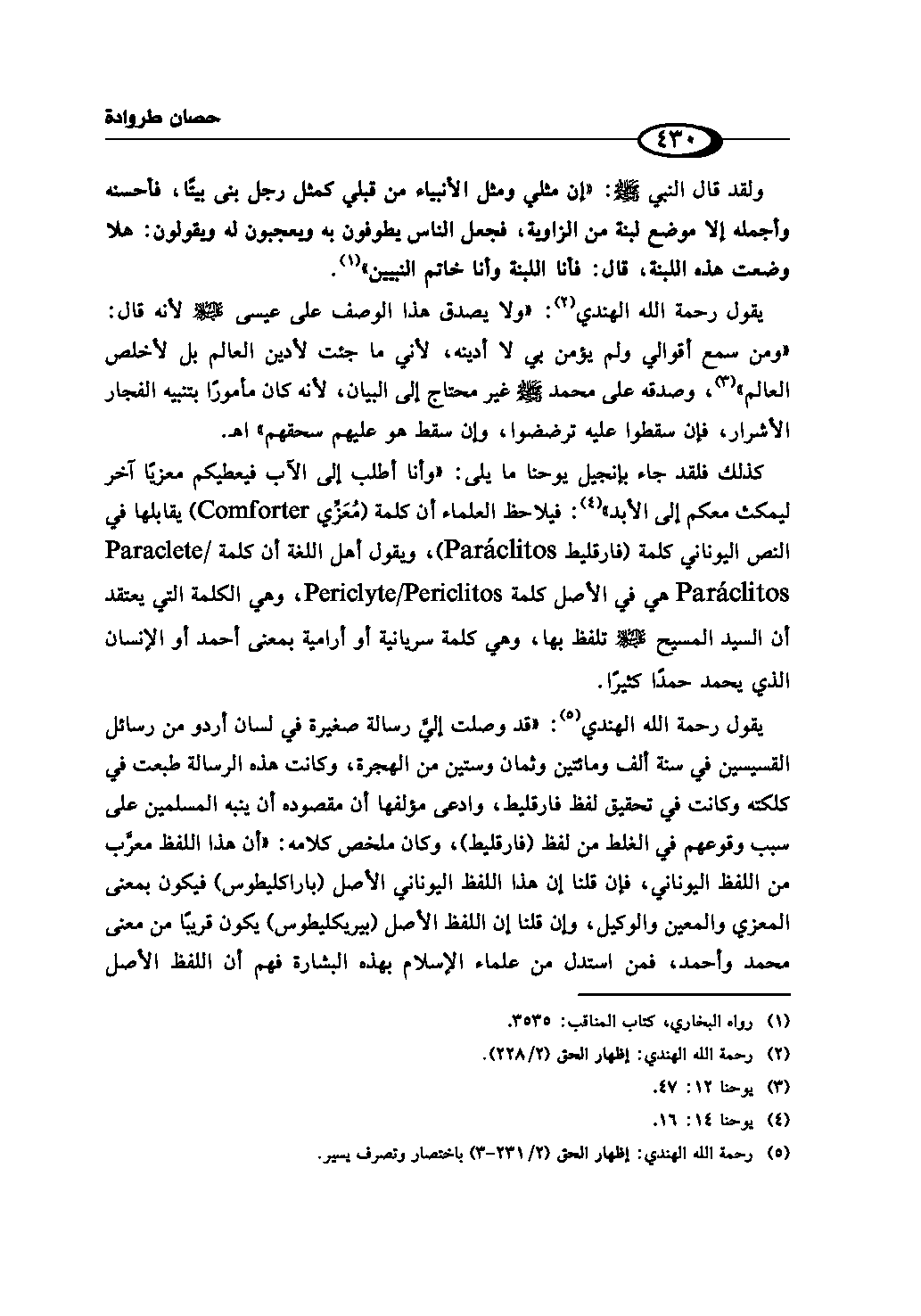 يقول رحمة الله الهندي (¬5): «قد وصلت إليَّ رسالة صغيرة في لسان أردو من رسائل القسيسين في سنة ألف ومائتين وثمان وستين من الهجرة، وكانت هذه الرسالة طبعت في كلكته وكانت في تحقيق لفظ فارقليط، وادعى مؤلفها أن مقصوده أن ينبه المسلمين على سبب وقوعهم في الغلط من لفظ (فارقليط)، وكان ملخص كلامه: "أن هذا اللفظ معرَّب من اللفظ اليوناني، فإن قلنا إن هذا اللفظ اليوناني الأصل (پاراكليطوس) فيكون بمعنى المعزي والمعين والوكيل، وإن قلنا إن اللفظ الأصل