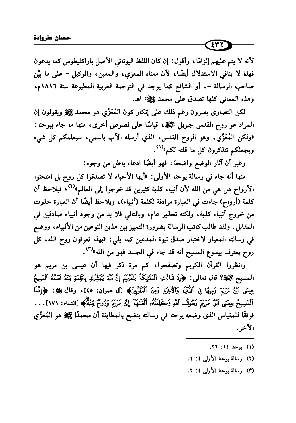 وانظروا القرآن الكريم وتصفحوا، كم مرة ذكر فيها أن عيسى بن مريم هو المسيح - عليه السلام -؟ قال تعالى: {إِذْ قَالَتِ الْمَلآئِكَةُ يَا مَرْيَمُ إِنَّ اللهَ يُبَشِّرُكِ بِكَلِمَةٍ مِّنْهُ اسْمُهُ الْمَسِيحُ عِيسَى ابْنُ مَرْيَمَ وَجِيهًا فِي الدُّنْيَا وَالآخِرَةِ وَمِنَ الْمُقَرَّبِينَ} (¬4)، وقال - عز وجل -: {إِنَّمَا الْمَسِيحُ عِيسَى ابْنُ مَرْيَمَ رَسُولُ اللهِ وَكَلِمَتُهُ أَلْقَاهَا إِلَى مَرْيَمَ وَرُوحٌ مِّنْهُ} (¬5) ... فوفقًا للمقياس الذى وضعه يوحنا في رسالته يتضح بالمطابقة أن محمدًا - صلى الله عليه وسلم - هو المُعزِّي الآخر.