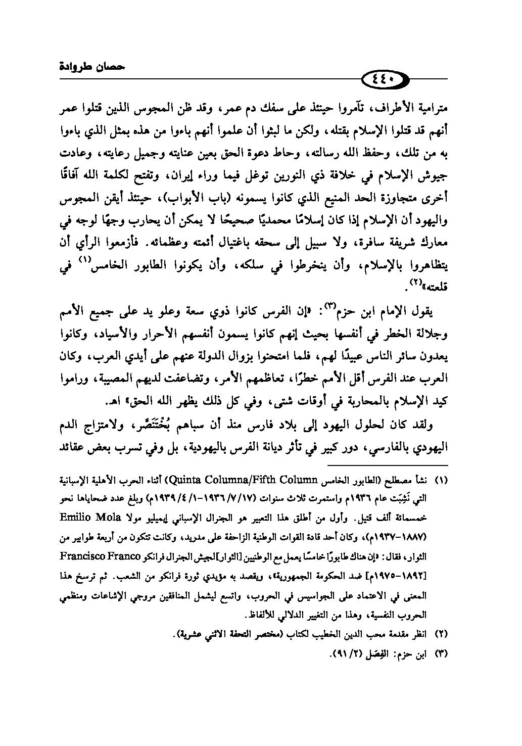 (¬1) نشأ مصطلح (الطابور الخامس Quinta Columna/Fifth Column) أثناء الحرب الأهلية الإسپانية التي نَشِبَت عام 1936م واستمرت ثلاث سنوات (17/ 7/1936 - 1/ 4/1939م) وبلغ عدد ضحاياها نحو خمسمائة ألف قتيل. وأول من أطلق هذا التعبير هو الچنرال الإسپاني إيميليو مولا Emilio Mola (1887 - 1937 م)، وكان أحد قادة القوات الوطنية الزاحفة على مدريد، وكانت تتكون من أربعة طوابير من الثوار، فقال: «إن هناك طابورًا خامسًا يعمل مع الوطنيين [الثوار] لجيش الچنرال فرانكو Francisco Franco [1892 - 1975 م] ضد الحكومة الجمهورية»، ويقصد به مؤيدي ثورة فرانكو من الشعب .. ثم ترسخ هذا المعنى في الاعتماد على الجواسيس في الحروب، واتسع ليشمل المنافقين مروجي الإشاعات ومنظمي الحروب النفسية، وهذا من التغيير الدلالي للألفاظ.