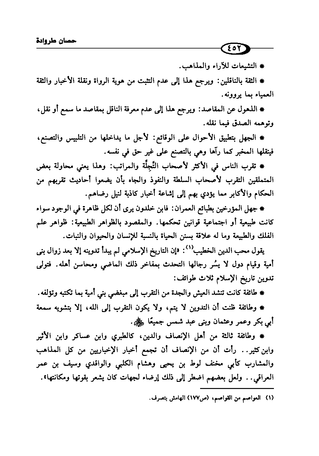 - وطائفة ثالثة من أهل الإنصاف والدين، كالطبري وابن عساكر وابن الأثير وابن كثير .. رأت أن من الإنصاف أن تجمع أخبار الإخباريين من كل المذاهب والمشارب كأبي مخنف لوط بن يحيى وهشام الكلبي والواقدي وسيف بن عمر العراقي .. ولعل بعضهم اضطر إلى ذلك إرضاء لجهات كان يشعر بقوتها ومكانتها».