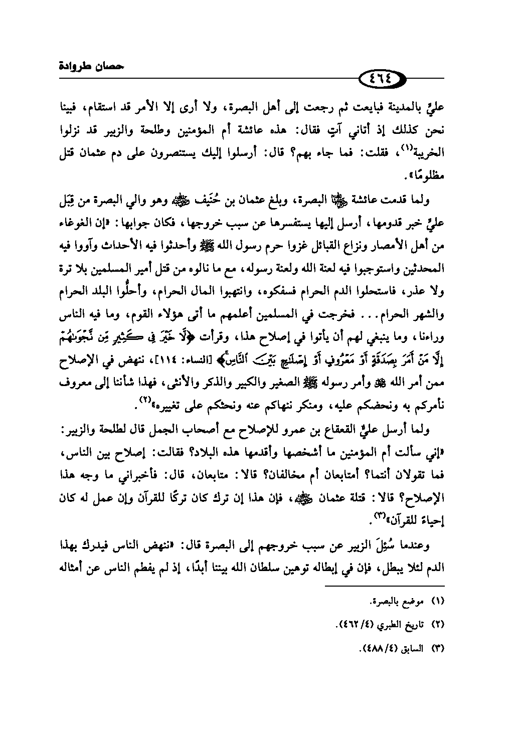 ولما أرسل عليٌّ القعقاع بن عمرو للإصلاح مع أصحاب الجمل قال لطلحة والزبير: «إني سألت أم المؤمنين ما أشخصها وأقدمها هذه البلاد؟ فقالت: إصلاح بين الناس، فما تقولان أنتما؟ أمتابعان أم مخالفان؟ قالا: متابعان، قال: فأخبراني ما وجه هذا الإصلاح؟ قالا: قتلة عثمان - رضي الله عنه -، فإن هذا إن ترك كان تركًا للقرآن وإن عمل له كان إحياءً للقرآن» (¬4).
