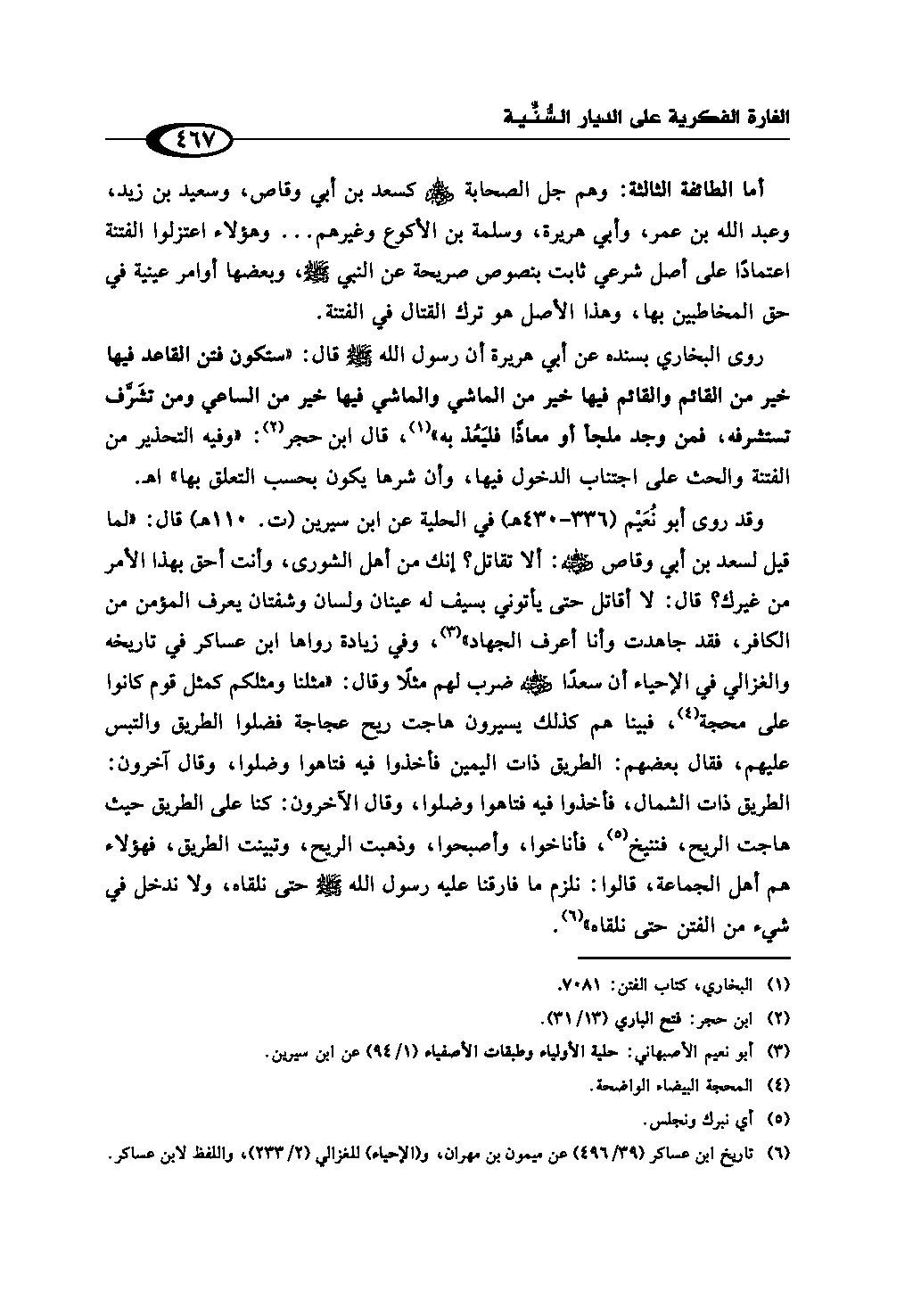 وقد روى أبو نُعَيْم (336 - 430هـ) في الحلية عن ابن سيرين (ت. 110هـ) قال: «لما قيل لسعد بن أبي وقاص - رضي الله عنه -: ألا تقاتل؟ إنك من أهل الشورى، وأنت أحق بهذا الأمر من غيرك؟ قال: لا أقاتل حتى يأتوني بسيف له عينان ولسان وشفتان يعرف المؤمن من الكافر، فقد جاهدت وأنا أعرف الجهاد» (¬3)، وفي زيادة رواها ابن عساكر في تاريخه والغزالي في الإحياء أن سعدًا - رضي الله عنه - ضرب لهم مثلًا وقال: «مثلنا ومثلكم كمثل قوم كانوا على محجة (¬4)، فبينا هم كذلك يسيرون هاجت ريح عجاجة فضلوا الطريق والتبس عليهم، فقال بعضهم: الطريق ذات اليمين فأخذوا فيه فتاهوا وضلوا، وقال آخرون: الطريق ذات الشمال، فأخذوا فيه فتاهوا وضلوا، وقال الآخرون: كنا على الطريق حيث هاجت الريح، فننيخ (¬5)، فأناخوا، وأصبحوا، وذهبت الريح، وتبينت الطريق، فهؤلاء هم أهل الجماعة، قالوا: نلزم ما فارقنا عليه رسول الله - صلى الله عليه وسلم - حتى نلقاه، ولا ندخل في شيء من الفتن حتى نلقاه» (¬6).