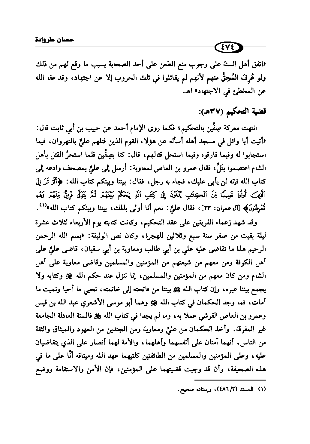 انتهت معركة صِفِّين بالتحكيم؛ فكما روى الإمام أحمد عن حبيب بن أبي ثابت قال: «أتيت أبا وائل في مسجد أهله أسأله عن هؤلاء القوم الذين قتلهم عليٌّ بالنهروان، فيما استجابوا له وفيما فارقوه وفيما استحل قتالهم، قال: كنا بصِفِّين فلما استحرَّ القتل بأهل الشام اعتصموا بتَلٍّ، فقال عمرو بن العاص لمعاوية: أرسل إلى عليٍّ بمصحف وادعه إلى كتاب الله فإنه لن يأبى عليك، فجاء به رجل، فقال: بيننا وبينكم كتاب الله {أَلَمْ تَرَ إِلَى الَّذِينَ أُوْتُوا نَصِيبًا مِّنَ الْكِتَابِ يُدْعَوْنَ إِلَى كِتَابِ اللهِ لِيَحْكُمَ بَيْنَهُمْ ثُمَّ يَتَوَلَّى فَرِيقٌ مِّنْهُمْ وَهُم مُّعْرِضُونَ} (¬2)، فقال عليٌّ: نعم أنا أولى بذلك، بيننا وبينكم كتاب الله» (¬3).