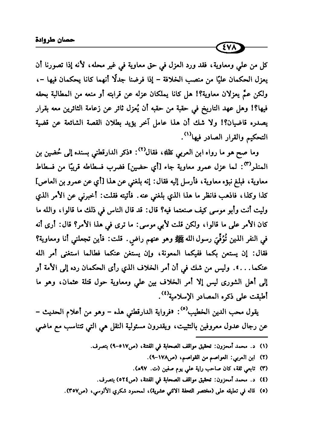 وما صح هو ما رواه ابن العربي رحمه الله، فقال (¬2): «ذكر الدارقطني بسنده إلى حُضين بن المنذر (¬3): لما عزل عمرو معاوية جاء [أي حضين] فضرب فسطاطه قريبًا من فسطاط معاوية، فبلغ نبؤه معاوية، فأرسل إليه فقال: إنه بلغني عن هذا [أي عن عمرو بن العاص] كذا وكذا، فاذهب فانظر ما هذا الذي بلغني عنه. فأتيته فقلت: أخبرني عن الأمر الذي وليت أنت وأبو موسى كيف صنعتما فيه؟ قال: قد قال الناس في ذلك ما قالوا، والله ما كان الأمر على ما قالوا، ولكن قلت لأبي موسى: ما ترى في هذا الأمر؟ قال: أرى أنه في النفر الذين تُوُفِّيَ رسول الله - صلى الله عليه وسلم - وهو عنهم راضٍ. قلت: فأين تجعلني أنا ومعاوية؟ فقال: إن يستعن بكما ففيكما المعونة، وإن يستغن عنكما فطالما استغنى أمر الله عنكما ...». وليس من شك في أن أمر الخلاف الذي رأى الحكمان رده إلى الأمة أو إلى أهل الشورى ليس إلا أمر الخلاف بين علي ومعاوية حول قتلة عثمان، وهو ما أطبقت على ذكره المصادر الإسلامية (¬4).