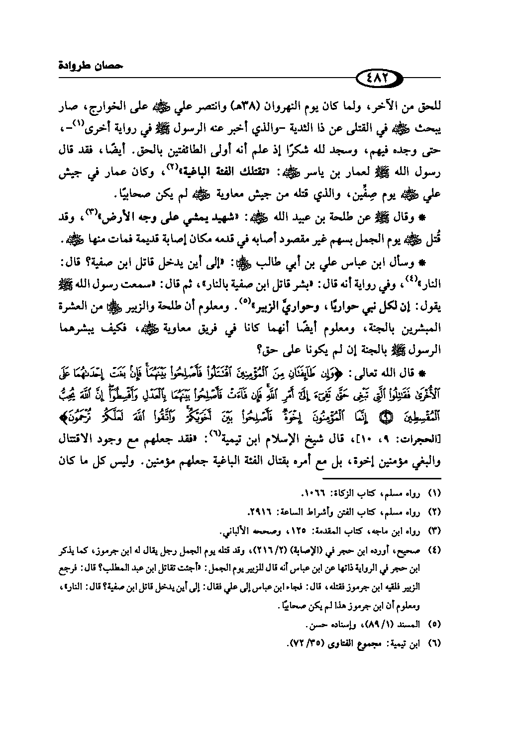 (¬4) صحيح، أورده ابن حجر في (الإصابة) (2/ 216)، وقد قتله يوم الجمل رجل يقال له ابن جرموز، كما يذكر ابن حجر في الرواية ذاتها عن ابن عباس أنه قال للزبير يوم الجمل: «أجئت تقاتل ابن عبد المطلب؟ قال: فرجع الزبير فلقيه ابن جرموز فقتله، قال: فجاء ابن عباس إلى علي فقال: إلى أين يدخل قاتل ابن صفية؟ قال: النار»، ومعلوم أن ابن جرموز هذا لم يكن صحابيًا.