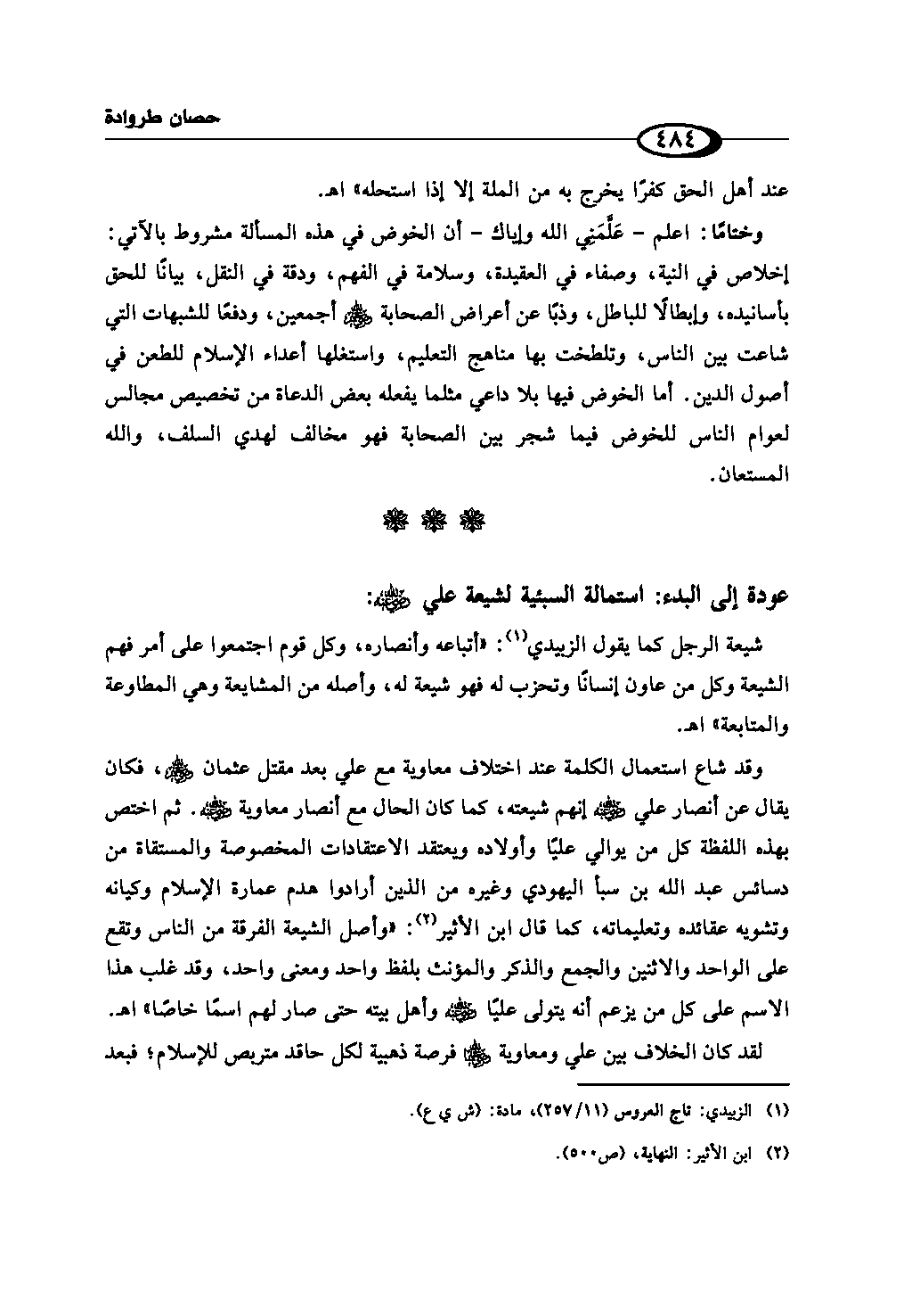وقد شاع استعمال الكلمة عند اختلاف معاوية مع علي بعد مقتل عثمان - رضي الله عنهم -، فكان يقال عن أنصار علي - رضي الله عنه - إنهم شيعته، كما كان الحال مع أنصار معاوية - رضي الله عنه -. ثم اختص بهذه اللفظة كل من يوالي عليًا وأولاده ويعتقد الاعتقادات المخصوصة والمستقاة من دسائس عبد الله بن سبأ اليهودي وغيره من الذين أرادوا هدم عمارة الإسلام وكيانه وتشويه عقائده وتعليماته، كما قال ابن الأثير (¬2): «وأصل الشيعة الفرقة من الناس وتقع على الواحد والاثنين والجمع والذكر والمؤنث بلفظ واحد ومعنى واحد، وقد غلب هذا الاسم على كل من يزعم أنه يتولى عليًا - رضي الله عنه - وأهل بيته حتى صار لهم اسمًا خاصًا» اهـ.