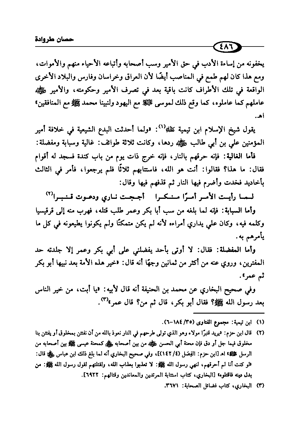 وأما السبابة: فإنه لما بلغه من سب أبا بكر وعمر طلب قتله، فهرب منه إلى قرقيسيا وكلمه فيه، وكان علي يداري أمراءه لأنه لم يكن متمكنًا ولم يكونوا يطيعونه في كل ما يأمرهم به.