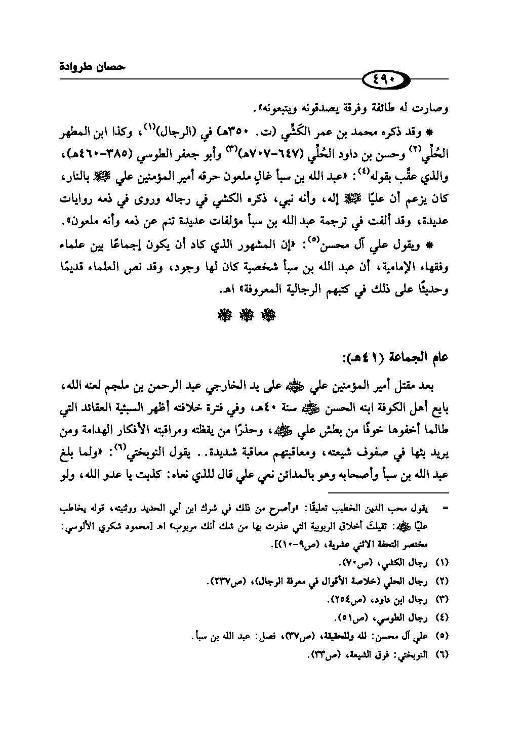 - وقد ذكره محمد بن عمر الكَشي (ت. 350هـ) في (الرجال) (¬1)، وكذا ابن المطهر الحُلِّي (¬2) وحسن بن داود الحلي (647 - 707هـ) (¬3) وأبو جعفر الطوسي (385 - 460هـ)، والذي عقَّب بقوله (¬4): «عبد الله بن سبأ غالٍ ملعون حرقه أمير المؤمنين علي - عليه السلام - بالنار، كان يزعم أن عليًا - عليه السلام - إله، وأنه نبي، ذكره الكشي في رجاله وروى في ذمه روايات عديدة، وقد ألفت في ترجمة عبد الله بن سبأ مؤلفات عديدة تنم عن ذمه وأنه ملعون».