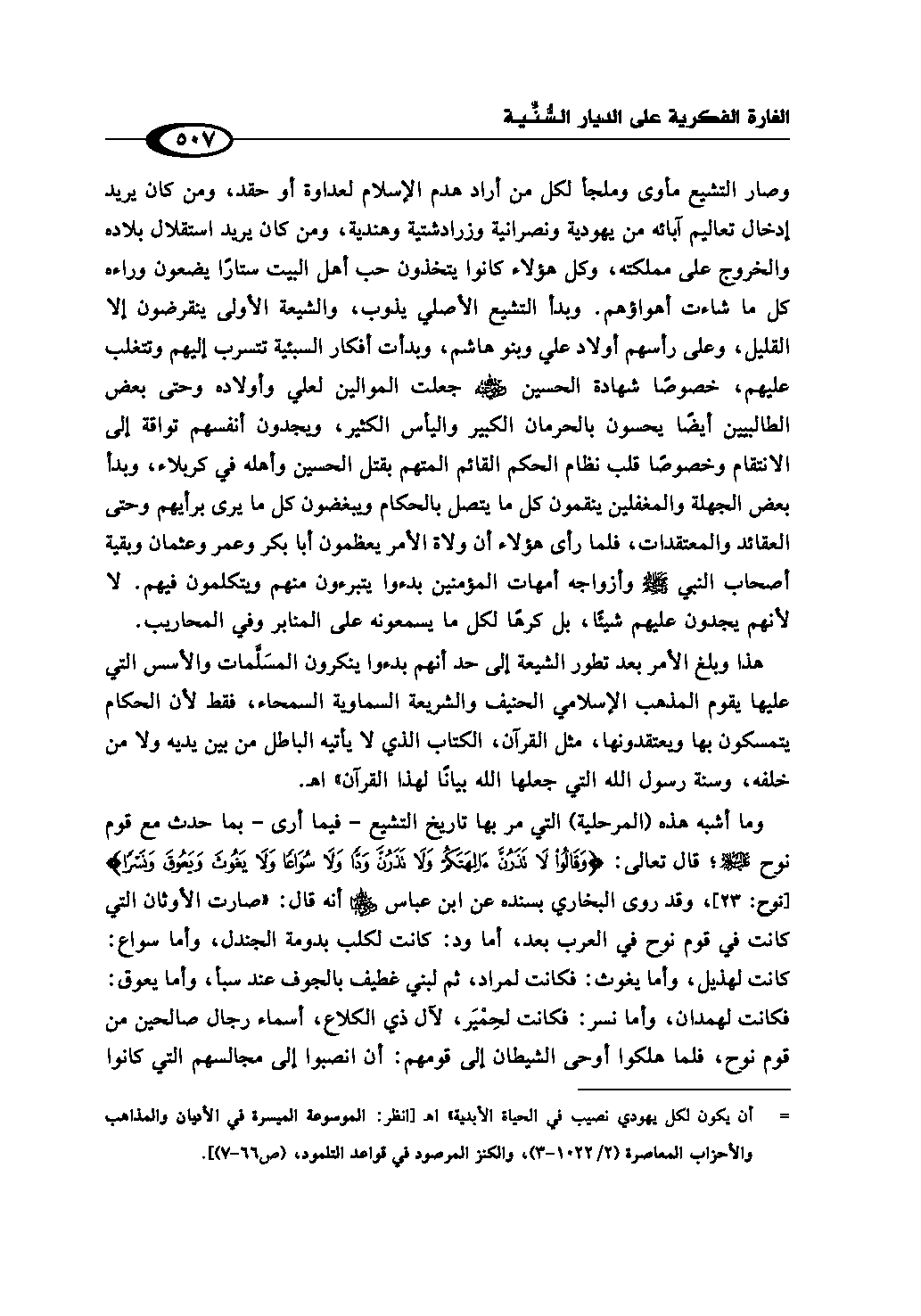 وما أشبه هذه (المرحلية) التي مر بها تاريخ التشيع - فيما أرى - بما حدث مع قوم نوح - عليه السلام -؛ قال تعالى: {وَقَالُوا لَا تَذَرُنَّ آلِهَتَكُمْ وَلَا تَذَرُنَّ وَدًّا وَلَا سُوَاعًا وَلَا يَغُوثَ وَيَعُوقَ وَنَسْرًا} (¬1)، وقد روى البخاري بسنده عن ابن عباس رضي الله عنهما أنه قال: «صارت الأوثان التي كانت في قوم نوح في العرب بعد، أما ود: كانت لكلب بدومة الجندل، وأما سواع: كانت لهذيل، وأما يغوث: فكانت لمراد، ثم لبني غطيف بالجوف عند سبأ، وأما يعوق: فكانت لهمدان، وأما نسر: فكانت لحِمْيَر، لآل ذي الكلاع، أسماء رجال صالحين من قوم نوح، فلما هلكوا أوحى الشيطان إلى قومهم: أن انصبوا إلى مجالسهم التي كانوا