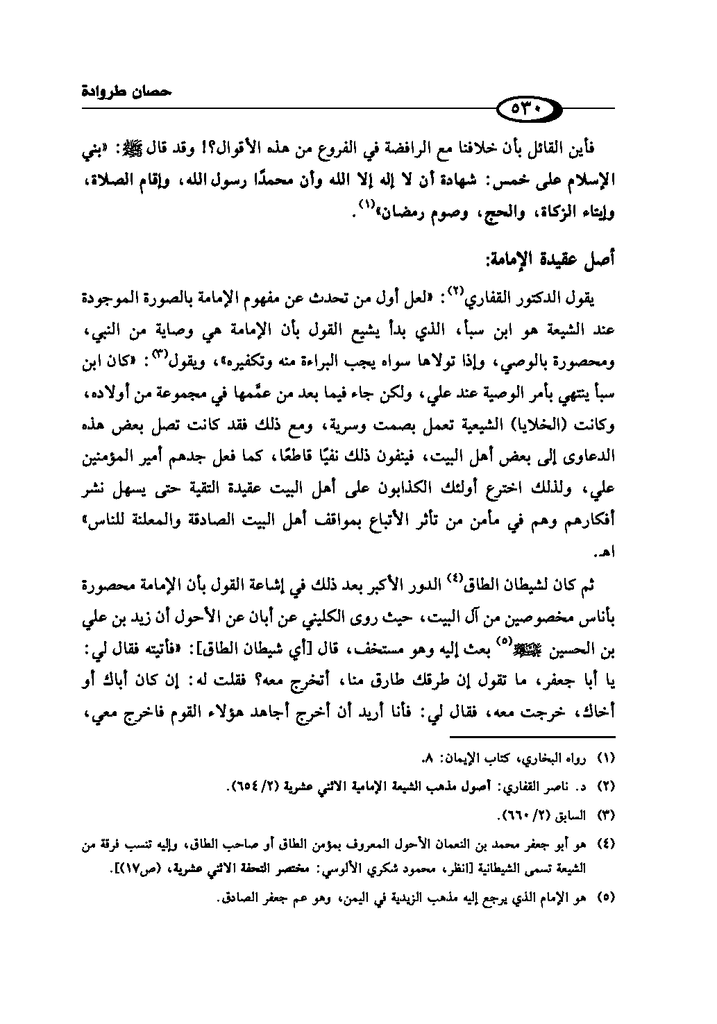 ثم كان لشيطان الطاق (¬4) الدور الأكبر بعد ذلك في إشاعة القول بأن الإمامة محصورة بأناس مخصوصين من آل البيت، حيث روى الكليني عن أبان عن الأحول أن زيد بن علي بن الحسين عليهما السلام (¬5) بعث إليه وهو مستخف، قال [أي شيطان الطاق]: «فأتيته فقال لي: يا أبا جعفر، ما تقول إن طرقك طارق منا، أتخرج معه؟ فقلت له: إن كان أباك أو أخاك، خرجت معه، فقال لي: فأنا أريد أن أخرج أجاهد هؤلاء القوم فاخرج معي،
