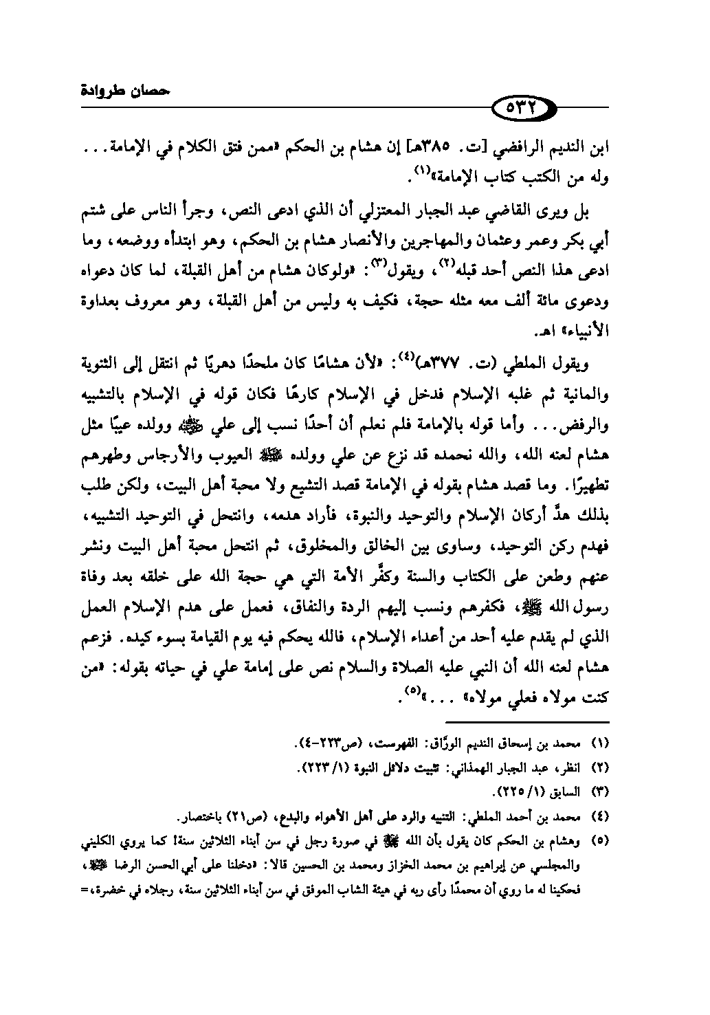 ابن النديم الرافضي [ت. 385هـ] إن هشام بن الحكم «ممن فتق الكلام في الإمامة ... وله من الكتب كتاب الإمامة» (¬1).