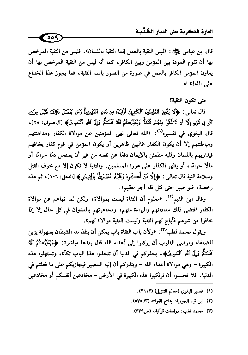 قال تعالى: {لاَّ يَتَّخِذِ الْمُؤْمِنُونَ الْكَافِرِينَ أَوْلِيَاء مِن دُوْنِ الْمُؤْمِنِينَ وَمَن يَفْعَلْ ذَلِكَ فَلَيْسَ مِنَ اللهِ فِي شَيْءٍ إِلاَّ أَن تَتَّقُوا مِنْهُمْ تُقَاةً وَيُحَذِّرُكُمُ اللهُ نَفْسَهُ وَإلى اللهِ الْمَصِيرُ} (¬1)، قال البغوي في تفسيره (¬2): «الله تعالى نهى المؤمنين عن موالاة الكفار ومداهنتهم ومباطنتهم إلا أن يكون الكفار غالبين ظاهرين أو يكون المؤمن في قوم كفار يخافهم فيداريهم باللسان وقلبه مطمئن بالإيمان دفعًا عن نفسه من غير أن يستحل دمًا حرامًا أو مالًا حرامًا، أو يظهر الكفار على عورة المسلمين. والتقية لا تكون إلا مع خوف القتل وسلامة النية قال تعالى: {إِلاَّ مَنْ أُكْرِهَ وَقَلْبُهُ مُطْمَئِنٌّ بِالإِيمَانِ} (¬3)، ثم هذه رخصة، فلو صبر حتى قتل فله أجر عظيم».